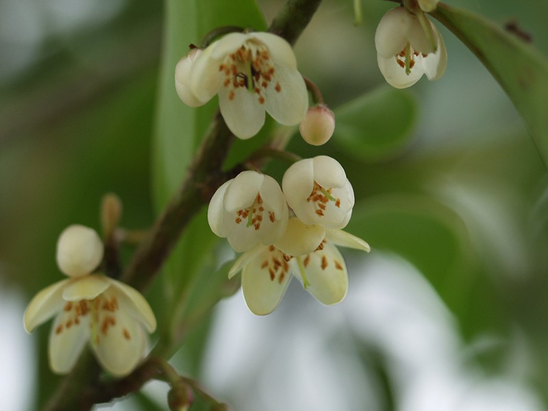 꽃은 6-7월에 핀다. 곁가지 기부의 잎겨드랑이에서 작은 황백색 꽃을 피운다. 꽃잎은 다섯 장이고, 잎 아래쪽에서 1-4개가 다발로 피어 아래로 늘어진다. 꽃의 색은 처음에는 희다가 점차 노랗게 된다. 열매는 10월경에 맺히며, 지름 7mm에서 8mm 정도의 액과로, 11월경에 검게 익는다.[12] 열매에는 자루가 있다.