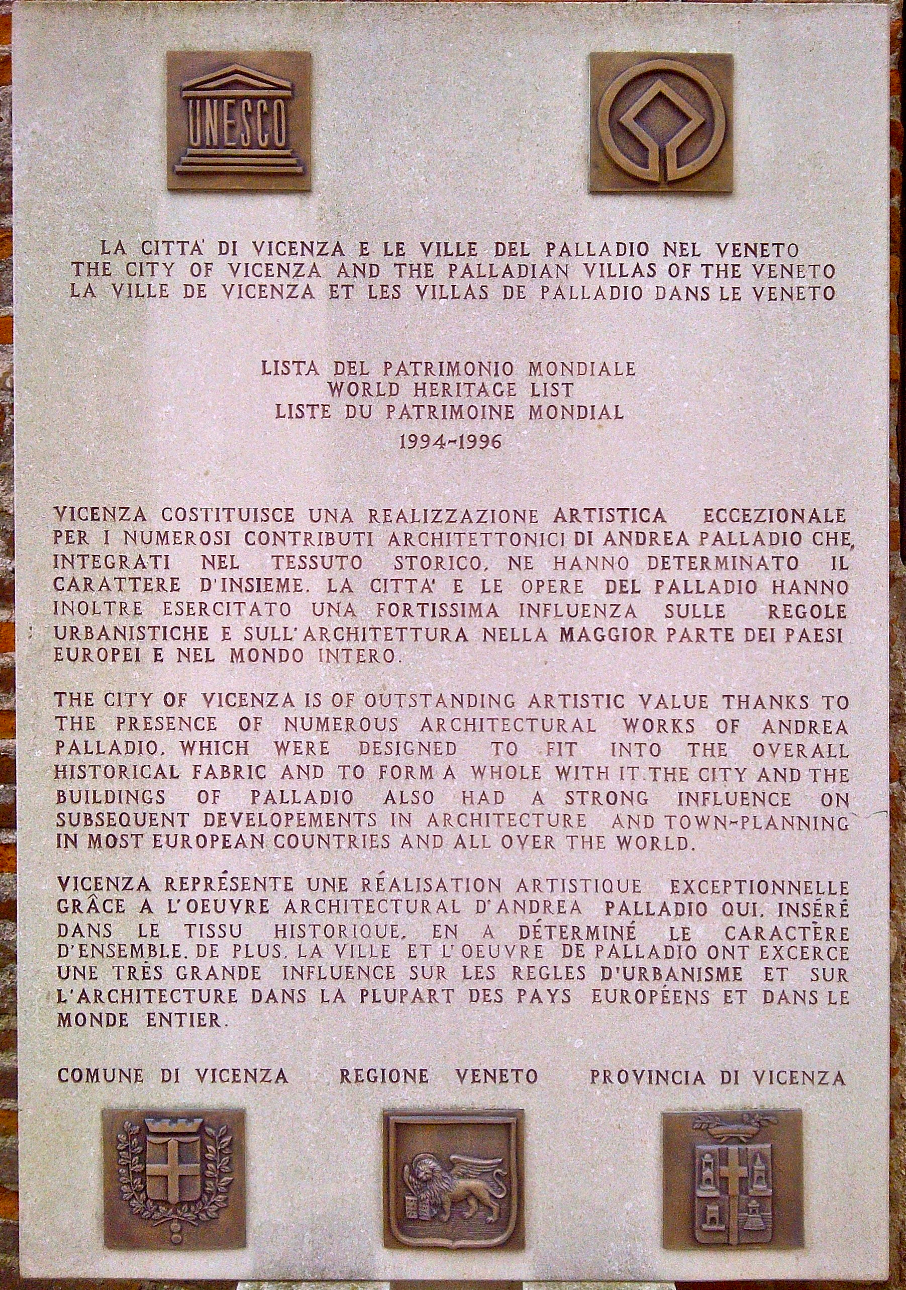 1994년 유네스코(UNESCO)는 "팔라디오의 도시 비첸차"를 세계유산(World Heritage Site) 목록에 등재했다.[1] 1996년에는 핵심 지역 외부의 팔라디오 빌라를 포함하도록 확장되어 "베네토의 비첸차 도시와 팔라디오 빌라(City of Vicenza and the Palladian Villas of the Veneto)"로 이름이 변경되었다.[1] 비첸차에는 팔라디오가 설계한 23개의 건물이 있다.주요 역사적 교회는 다음과 같다.