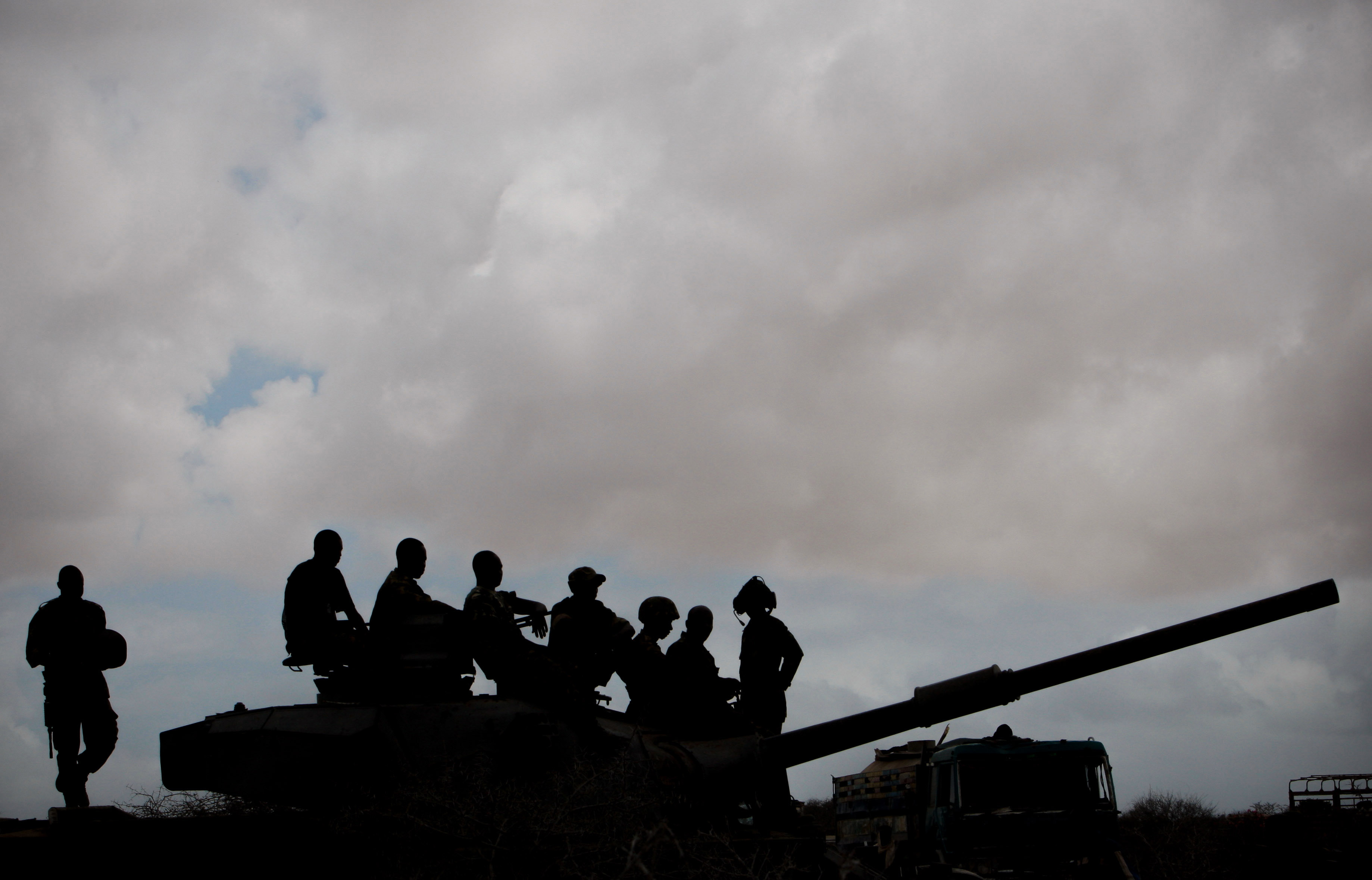 2012년 소말리아 키스마요 외곽에서 비커스 3형 위에 탑승한 케냐군 병사들의 실루엣
