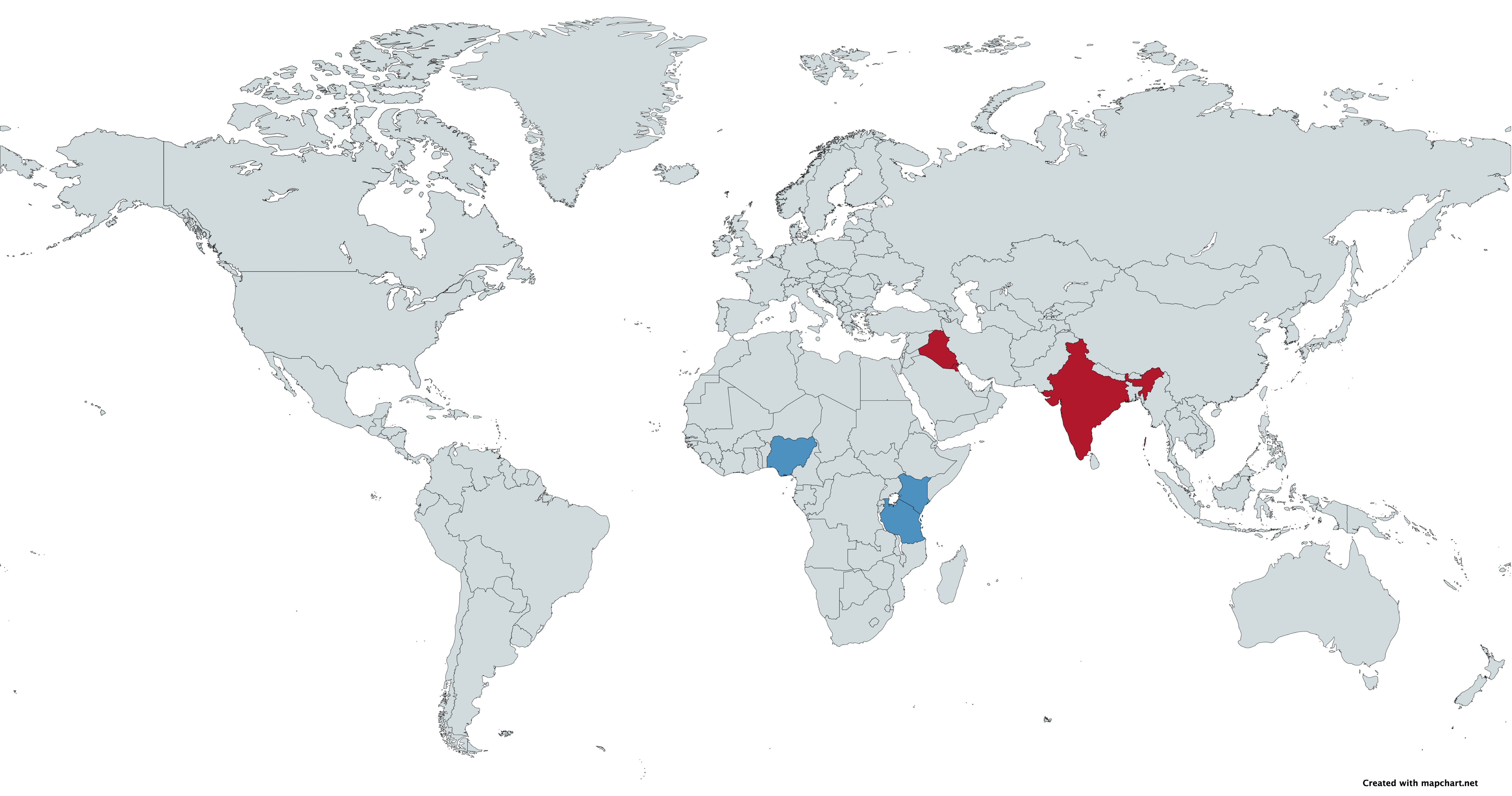 운용국 현황. 파란색은 현재 운용국, 빨간색은 과거 운용국을 나타낸다.