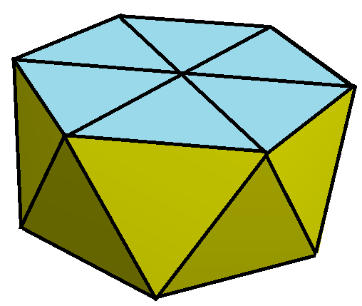 이 집합에는 삼각형 다면체인 경우가 두 가지 있다. 즉, 완전히 정삼각형으로만 구성된 다면체는 존슨의 다면체인 비틀어 늘린 사각쌍뿔과 플라톤의 다면체인 정이십면체이다. ''비틀어 늘린 삼각쌍뿔''은 정삼각형으로 만들 수는 있지만, 동일 평면에 있는 면 때문에 엄밀히 볼록하지 않다. 따라서 삼각형 다면체는 아니다. 삼각형들의 쌍은 마름모로 합쳐져서 엇삼각쌍뿔로 볼 수 있다.