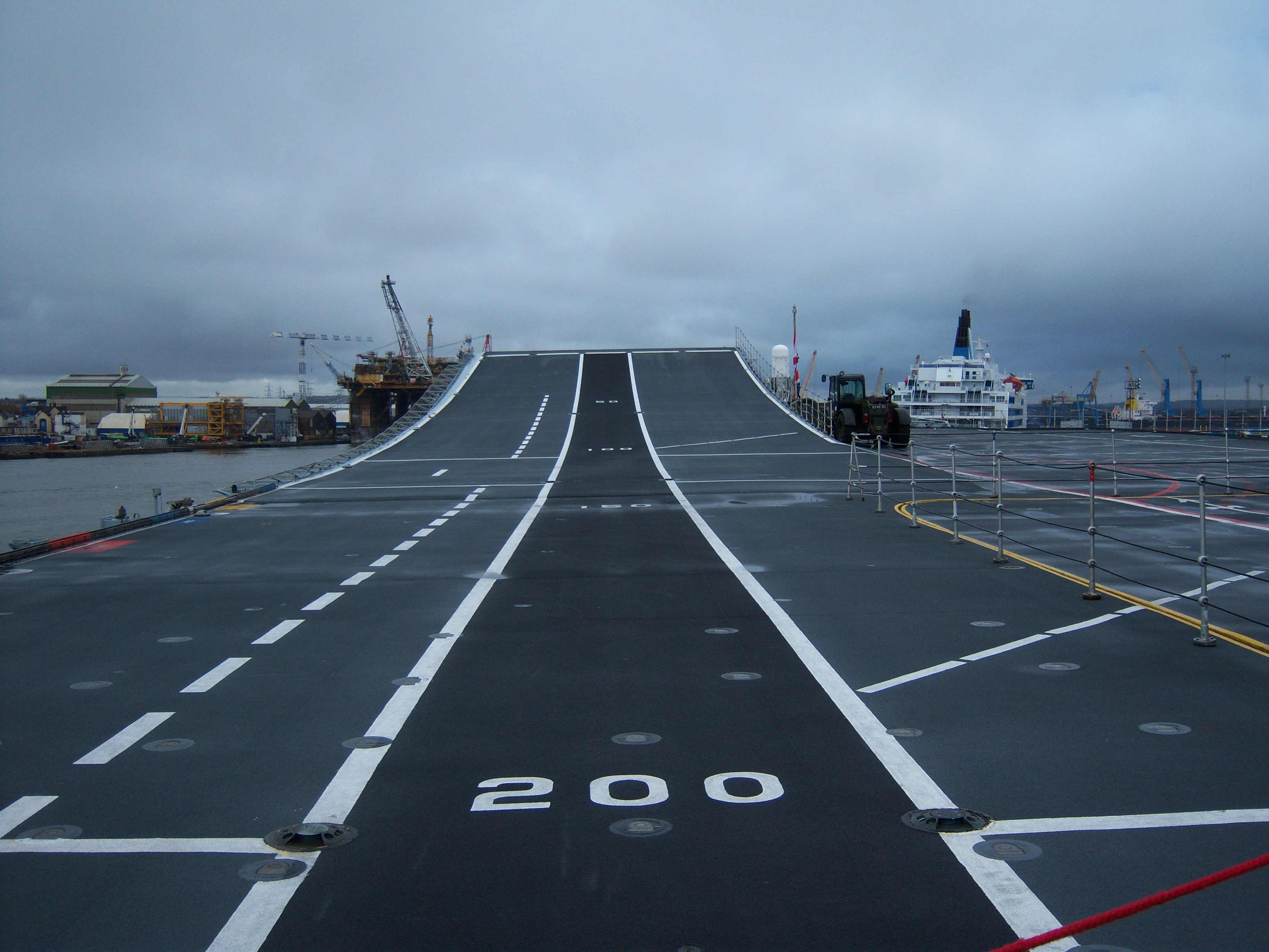 - 그러나 CATOBAR(캐터펄트 이륙/강제 착륙) 방식보다 긴 활주 거리가 필요하여 항공기 운용 효율이 낮고, 최대 이륙 중량에도 제약이 따른다.[46]