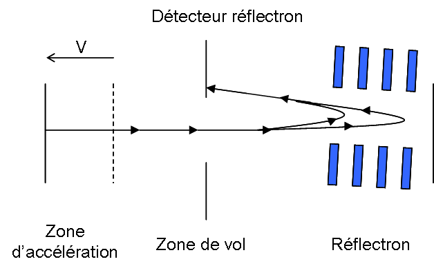 • 리플렉트론: 이온의 운동 에너지 분포를 보정하여 분해능을 높이는 장치이다. 정전기장을 이용하여 이온 빔을 반사시켜, 동일한 질량 대 전하비를 가지지만 에너지가 다른 이온들이 검출기에 동시에 도달하게 한다.