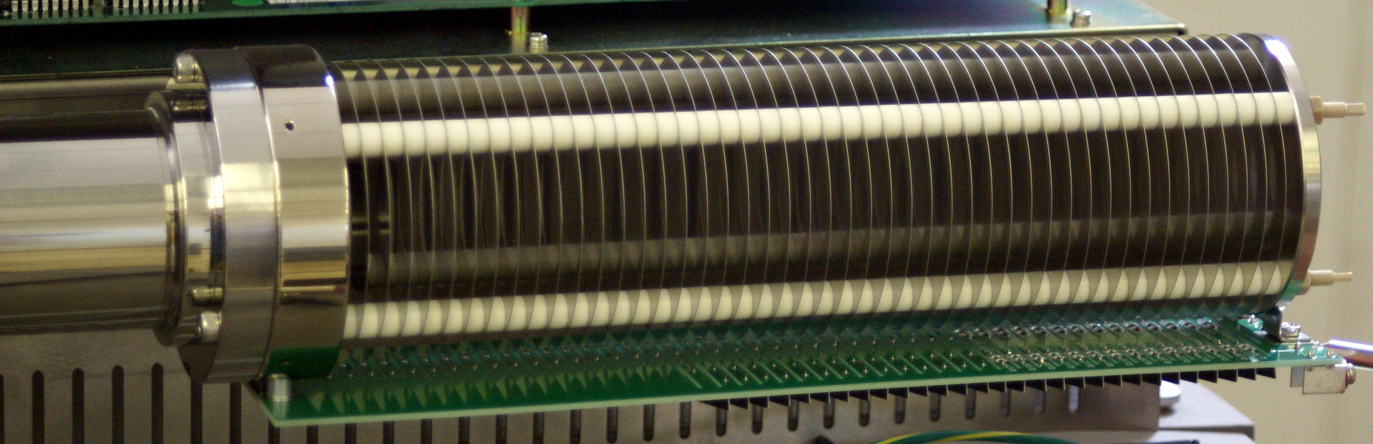 시마즈 IT-TOF 장비의 이중 단계 리플렉트론. 46개의 금속판은 전위 기울기를 설정하는 전압을 전달한다.