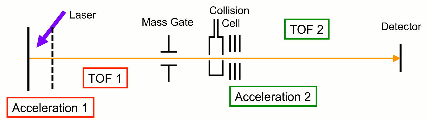 TOF/TOF에서 이온은 첫 번째 TOF로 가속되어 충돌 셀로 질량 게이팅되고, 단편 이온은 두 번째 TOF에서 분리된다.