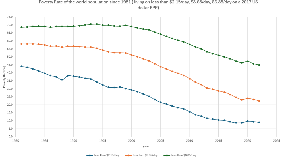 첸과 라발리온의 연구에 따르면, 1981년 개발도상국에서는 약 19억 명이 하루 1.25달러 미만으로 생활했지만, 2005년에는 14억 명으로 감소했다.[400] 절대적 빈곤 상태에 있는 세계 인구의 비율은 1981년 43%에서 2011년 14%로 감소했고,[401] 빈곤층의 절대 인구 수는 1981년 19억 5천만 명에서 2011년 10억 1천만 명으로 줄었다.[401] 경제학자 맥스 로저(Max Roser)는 1820년 세계 인구의 대다수가 빈곤하게 살고 있었기 때문에, 가난에 빠진 사람들의 수가 200년 전과 거의 같다고 추정한다.