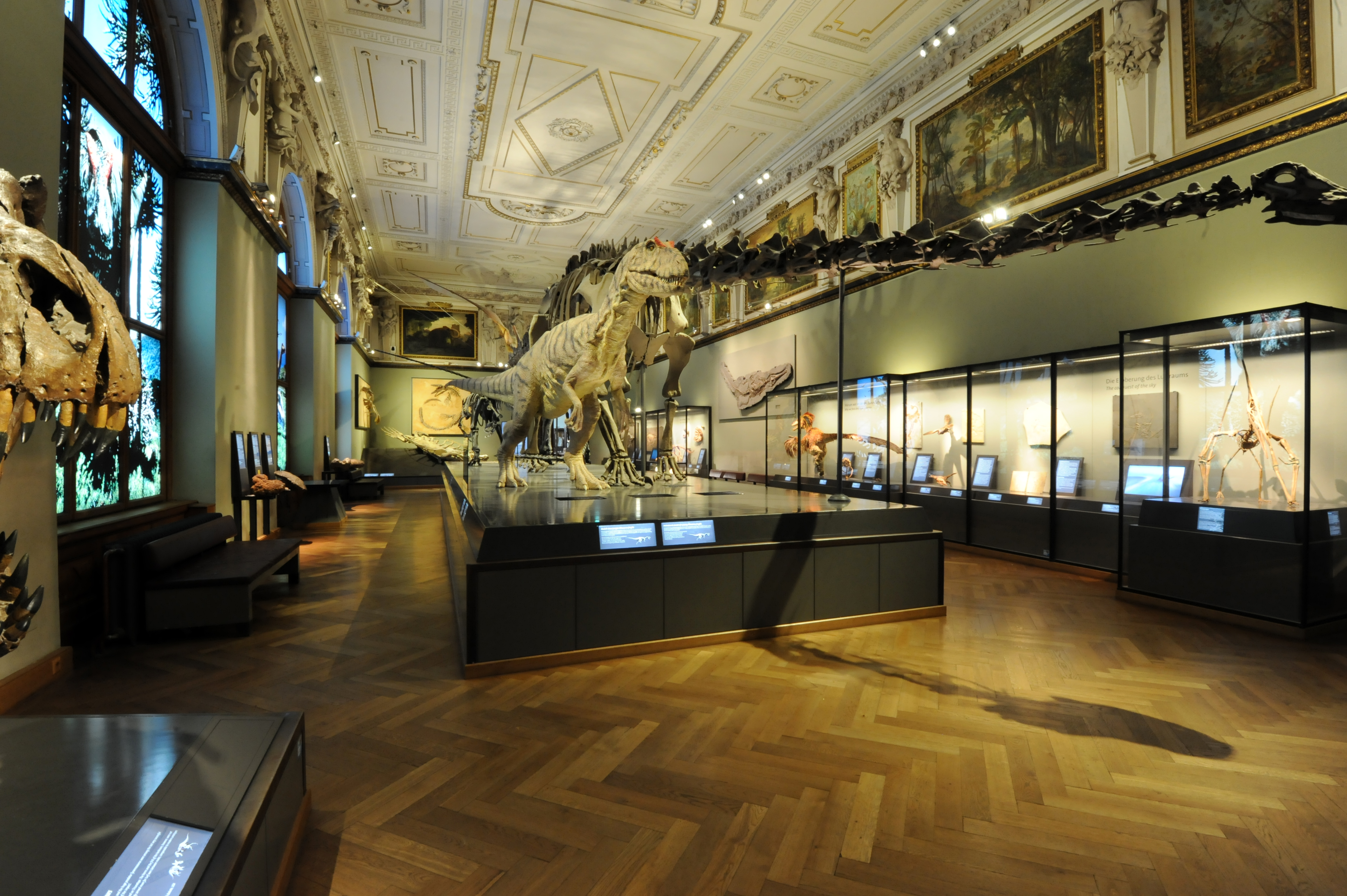 건물 내부 구조는 전시와 개별 부서의 체계적인 조직에 의해 결정되었다. 중이층(메자닌)에는 무생물(광물, 암석), 지구 초기 역사(지질, 고생물), 초기 인류 역사(선사시대), 인류 발달(인류학)이 전시되어 있다. 1층에는 다양한 동물(동물학)과 미생물의 세계("미크로극장")가 전시되어 있다.[12]