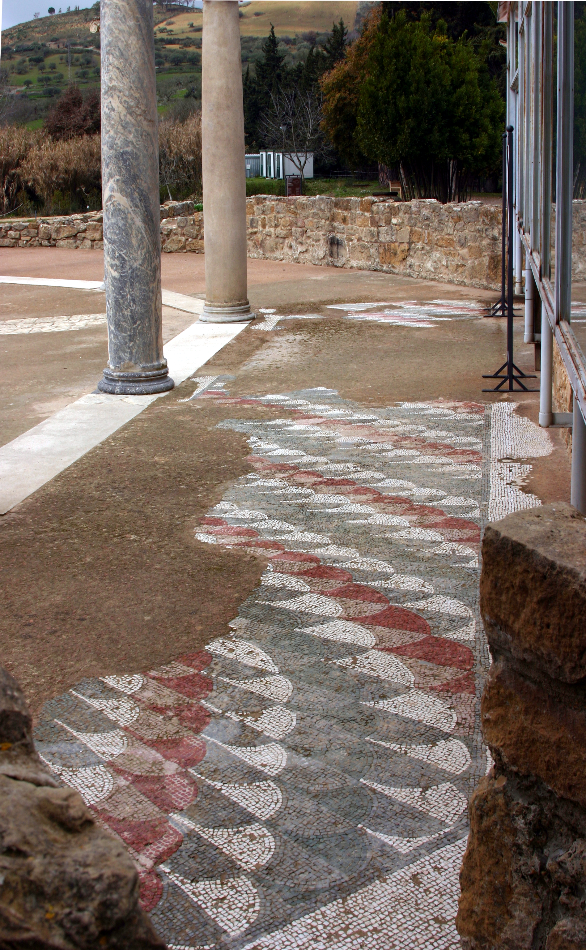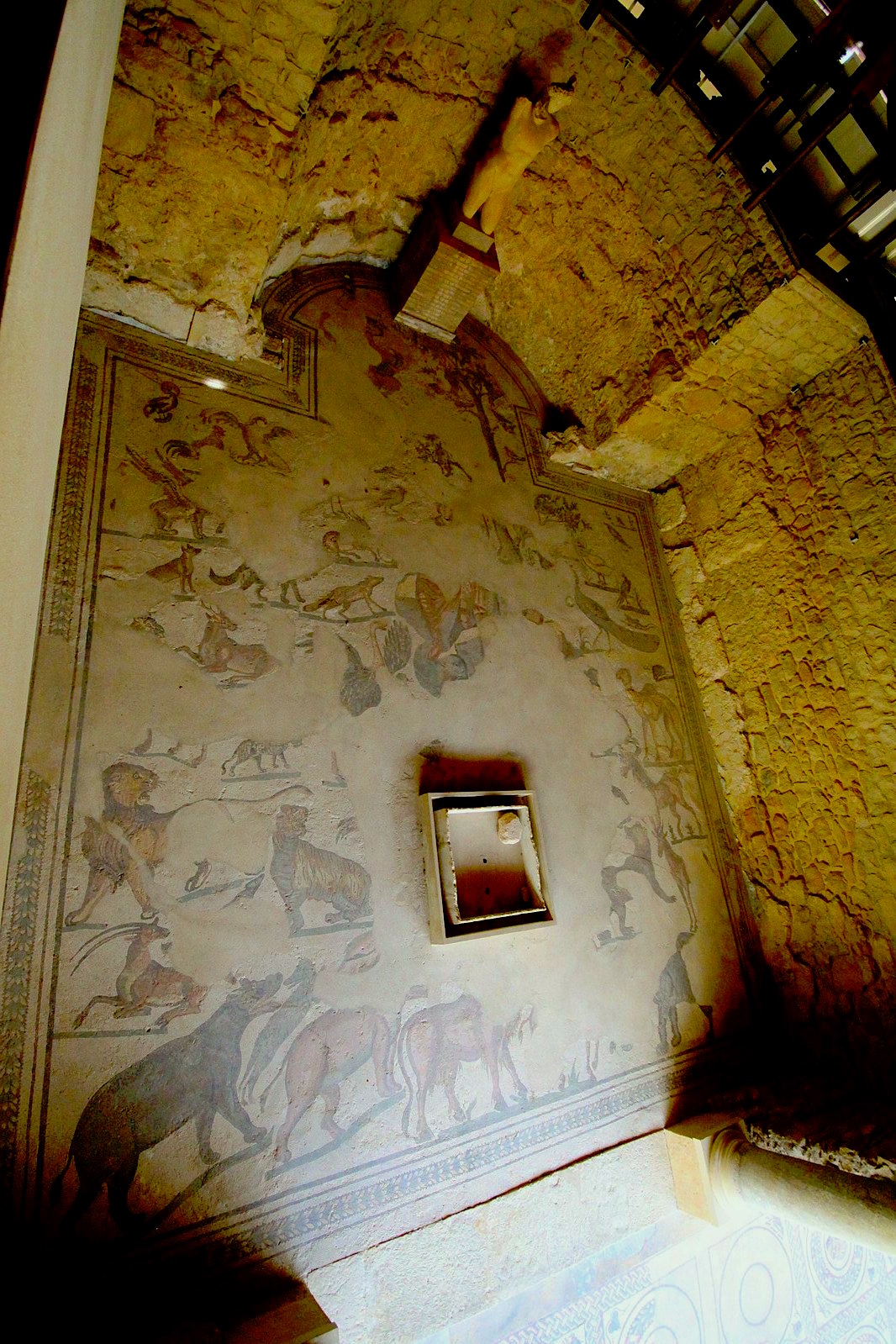잘 보존된 또 다른 모자이크는 사냥 장면을 묘사한다. 이 모자이크에는 남성들이 개와 함께 사냥하고 다양한 사냥감을 포획하는 모습이 담겨 있다.5. 세계유산 등록 기준