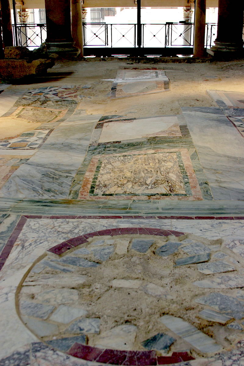 입구 바닥에는 지중해 전역에서 가져온 대리석으로 만든 매우 정교한 다색 opus sectile|오푸스 세크틸레la가 깔려 있었는데, 이는 빌라에서 가장 화려한 장식이었다. 이 opus sectile|오푸스 세크틸레la 장식은 벽까지 덮고 있었으며, 모자이크가 아닌 이런 종류의 대리석은 고대 로마에서 가장 명망 높은 건축 자재로 여겨졌다.