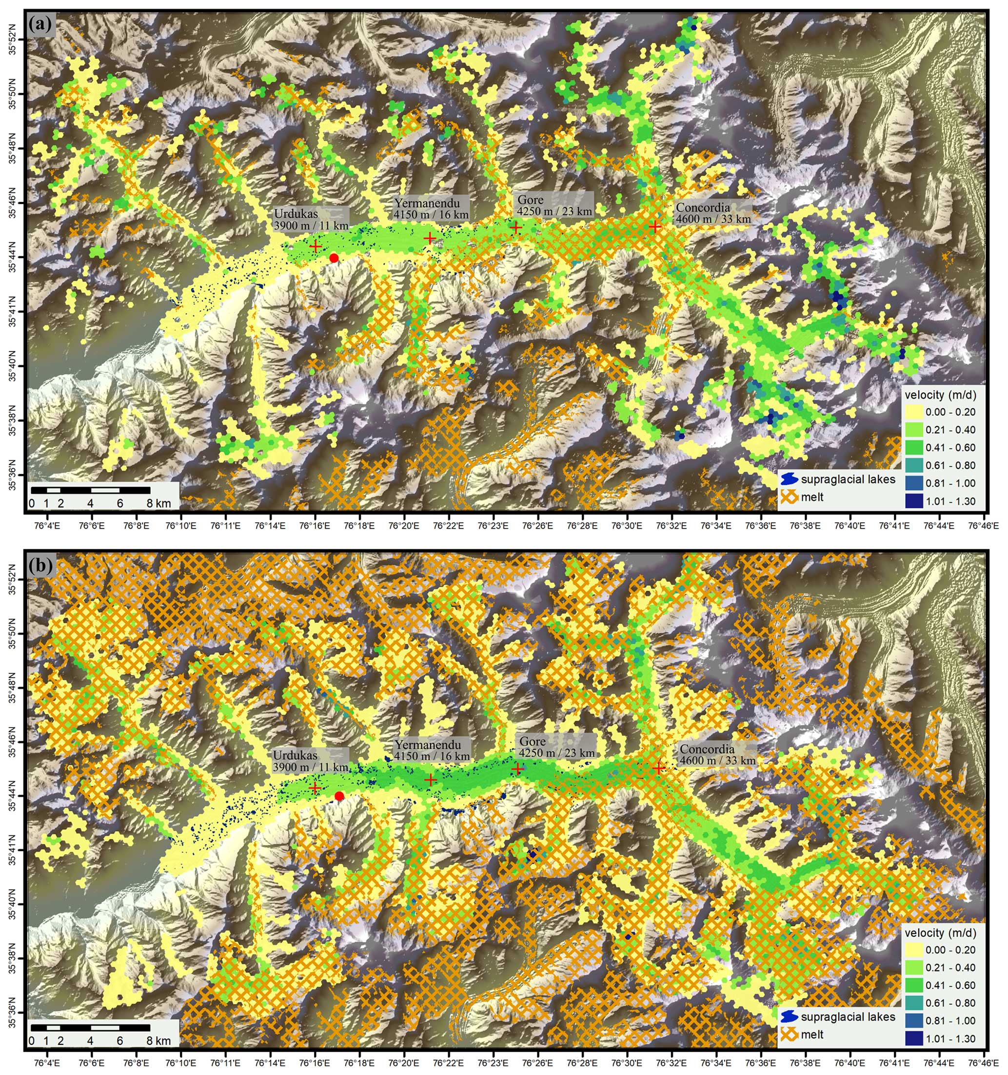이동 원인 | 얼음의 중력 기저면에서의 슬라이딩 내부 변형 |