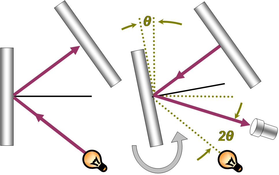 탐지기는 빛의 근원으로부터 2\theta 만큼인 각도에 위치하는데 그 이유는 법선을 기준으로 회전거울이 \theta 만큼 회전하고, 빛의 입사각과 그 반사각으로 인해 \theta 만큼 줄어들기 때문이다.