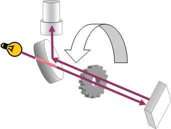 1849년, 이폴리트 피조회전하는 톱니바퀴를 이용하여 지구상에서 처음으로 빛의 속력을 측정하였다.[183] 피조는 램프의 빛을 빔 스플리터로 직각으로 꺾어, 720개의 톱니가 달린 톱니바퀴를 통과시켜 빛을 등간격으로 분단하여 방출하고, 약 8.6 km 떨어진 반사경에서 되돌려, 같은 톱니바퀴를 통해 관찰했다. 톱니바퀴의 회전이 느린 동안에는 오목부를 통과한 빛은 반사되어 같은 오목부에서 보이지만, 회전수를 올리면 반사광이 볼록부(톱니 부분)에서 차단된다. 피조는 이 때의 12.6회전/초 로부터 광속을 약 313,000 km/s로 계산했다.[183]