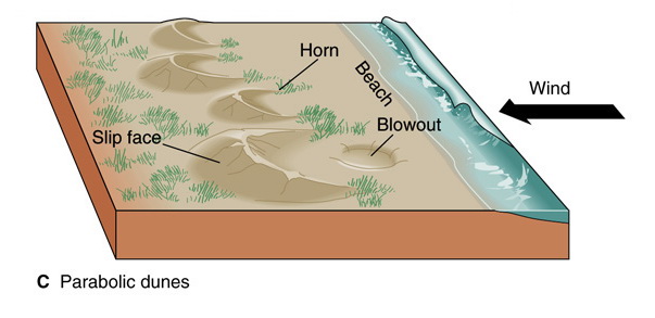 포물선 사구 | 바람 위쪽은 급경사, 아래쪽은 완경사 | |