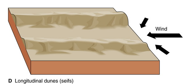 - 종사구(세이프): 바람이 두 방향으로 불 때 만들어지는 사구로, 바람 방향으로 길게 뻗어 있다. 사하라 사막과 아라비아 반도에서 흔히 볼 수 있으며, 높이가 수백 미터에 달하는 거대한 규모를 자랑한다.[25]