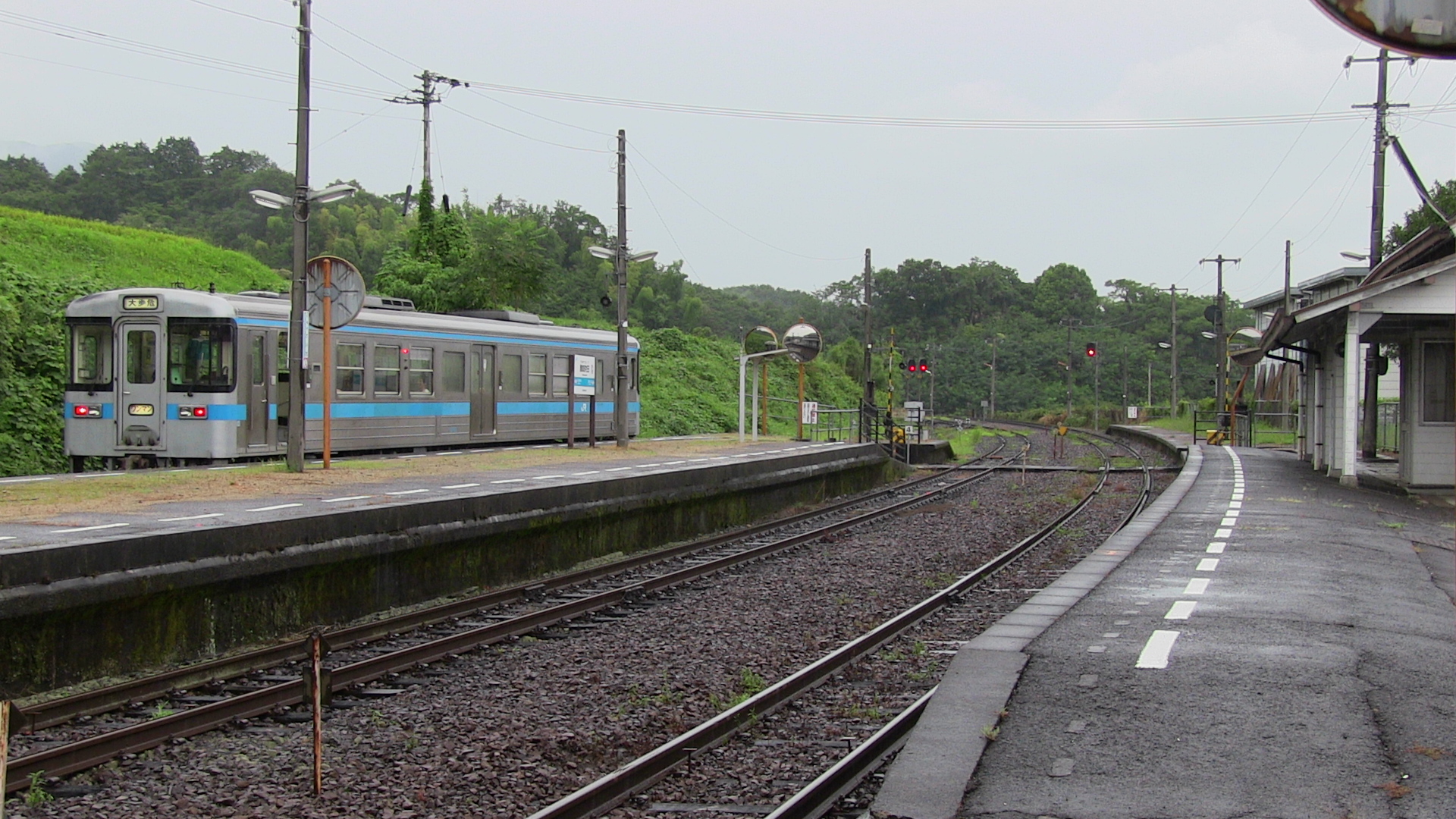 이 역은 직원이 배치되지 않았으며, 단선 승강장과 섬식 승강장을 합쳐 3개의 선로를 운영한다. 단선 승강장 옆 건물은 대기실로 사용되며, 두 개의 선로를 가로지르는 횡단보도를 통해 섬식 승강장으로 접근할 수 있다. 주차장과 자전거 보관소가 마련되어 있다.[1][4]단선·섬식 혼합 2면 3선의 지상역으로 일선 스루이다. 반경 604m의 곡선에 3.3‰의 구배상에 위치하며[11], 역 건물 측 1번선이 상하 본선(고토히라역 방면 제한 속도 100km/h, 아와이케다역 방면 제한 속도 85km/h)이다. 2번선은 하행 부본선으로 상행 방향의 입선·출발은 불가능하다. 3번선이 상하 부본선이다. 열차끼리의 교행과 열차의 추월이 가능하다. 승강장 간 이동은 구내 건널목을 이용한다.