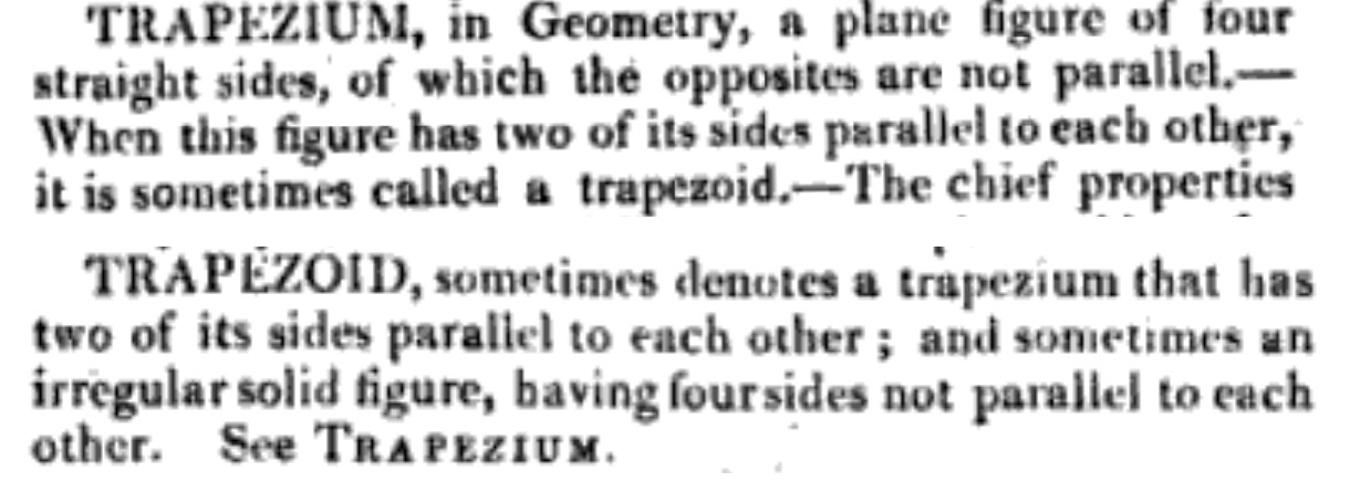 따라서 영국 영어에서는 trapezium이 사다리꼴을, trapezoid가 평행한 변이 없는 사각형을 의미하는 반면, 미국 영어에서는 반대로 trapezium이 평행한 변이 없는 사각형을, trapezoid가 사다리꼴을 의미한다.