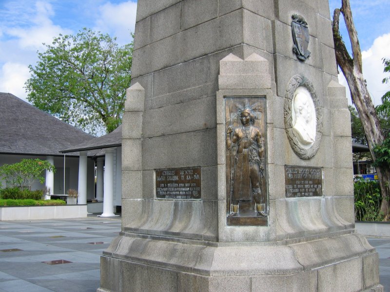 구 법원 밖 브룩 기념관. 사라왁 원주민 전사의 청동 조각상이 보인다.