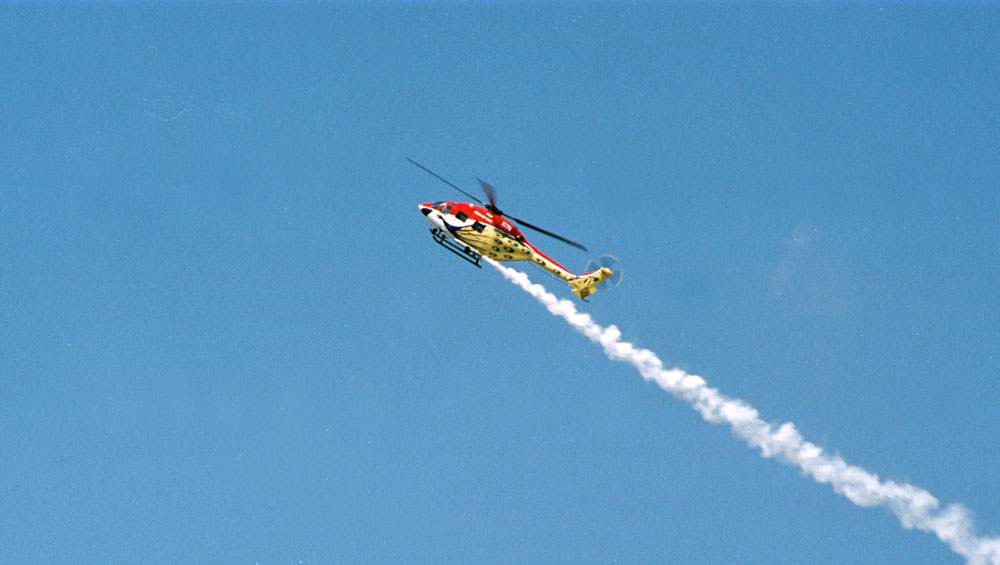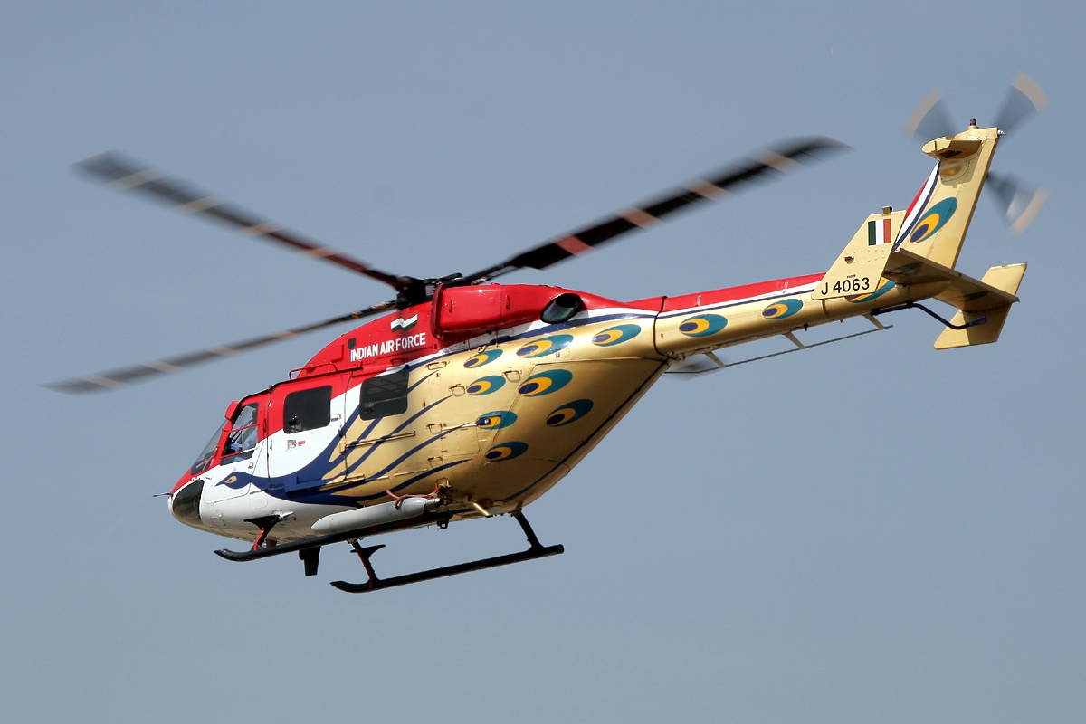 팀은 특별 공작새 색상으로 칠해진 개조된 HAL 드루브 헬리콥터를 사용한다.
