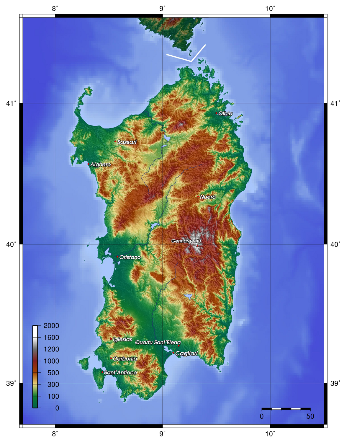 사르데냐섬은 지중해 서부 중앙에 위치하며, 섬의 면적은 24,090km²이다.