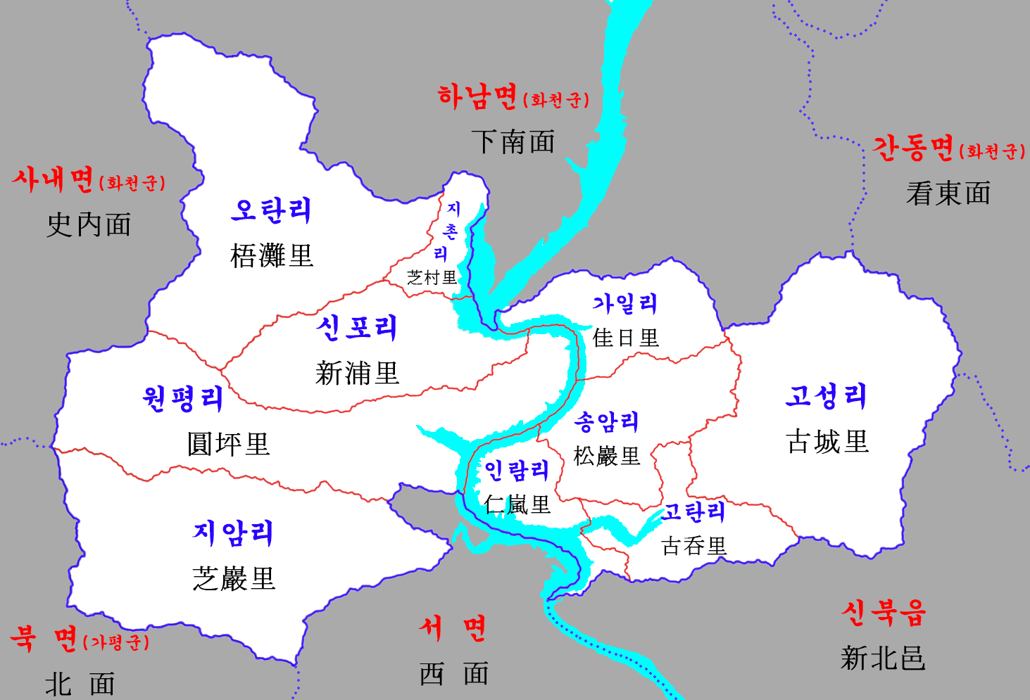 1945년 9월 2일, 38선을 경계로 분단되어 북쪽의 신포리, 지촌리, 가일리, 오탄리 4개 리 전체와 원평리, 송암리, 고성리 3개 리의 북부가 북한에 속하였다.