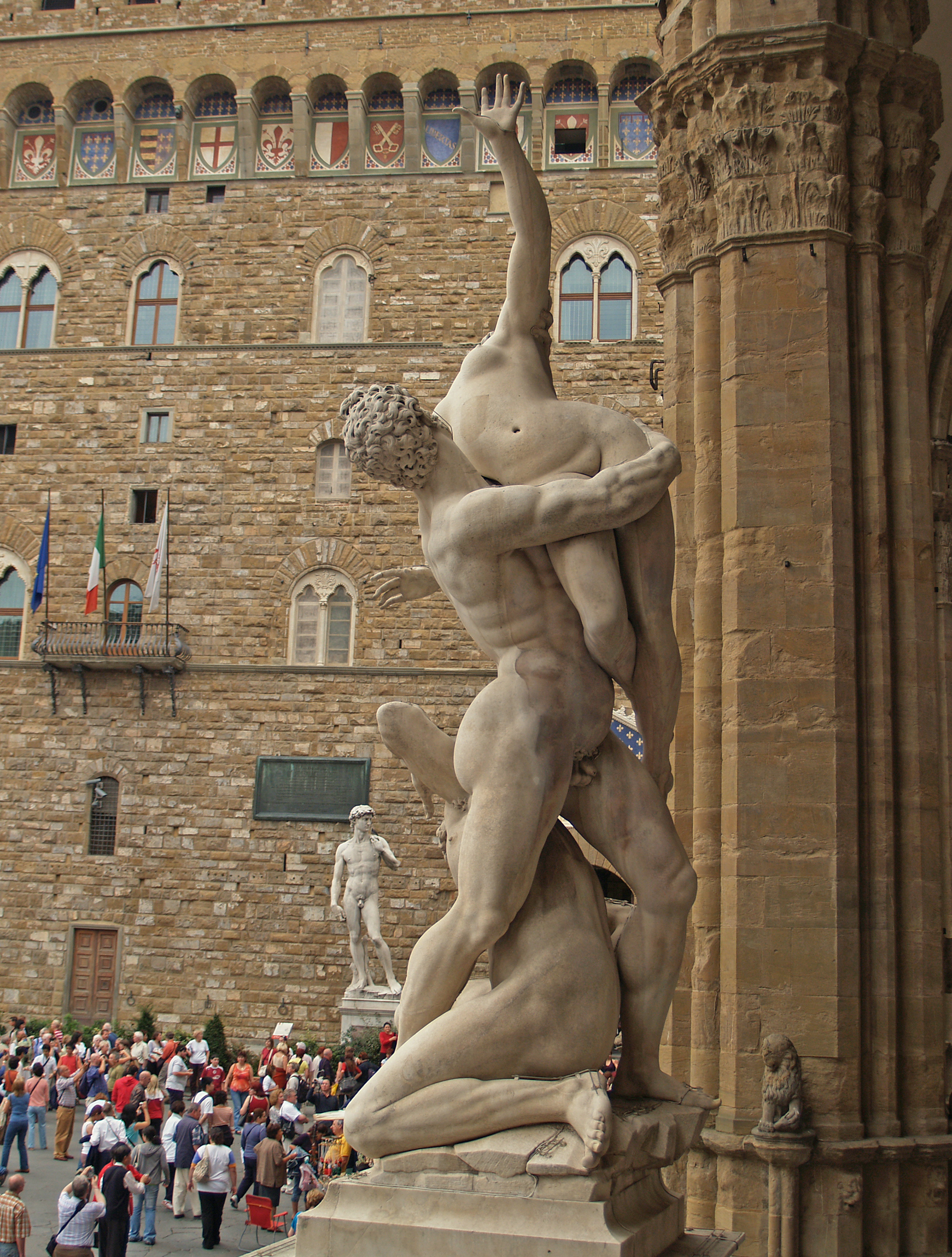 벤베누토 첼리니의 페르세우스 동상 맞은편에 제안된 조각 장소는 그룹이 안드로메다 강간과 같은 이전 작품과 관련된 주제를 설명해야 한다는 주장을 촉발했다. 프로세르피나와 헬레네의 각각의 강간도 가능한 주제로 제기되었다. 결국 조각품이 사비니 처녀 중 하나로 확인되기로 결정되었다.