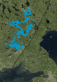 위성 사진에서 강조 표시된 사이마 호수, 아래쪽에 핀란드 만, 오른쪽에 라도가 호가 보입니다. 검은 선은 러시아-핀란드 국경입니다.