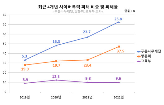2020년, 푸른나무재단은 사이버폭력을 ''의사소통을 목적으로 하는 다양한 전자기기를 매개로 발생하며, 연령과 상관없는 대상으로부터 본인이 원하지 않는 피해를 받았다고 인식하고, 일회적 혹은 반복적으로 발생하는 횟수와 상관없이 일어나 피해를 주는 부정적인 모든 행위''로 정의하여, 피해자 관점을 중심으로 한 정의를 제시하였다.[235]