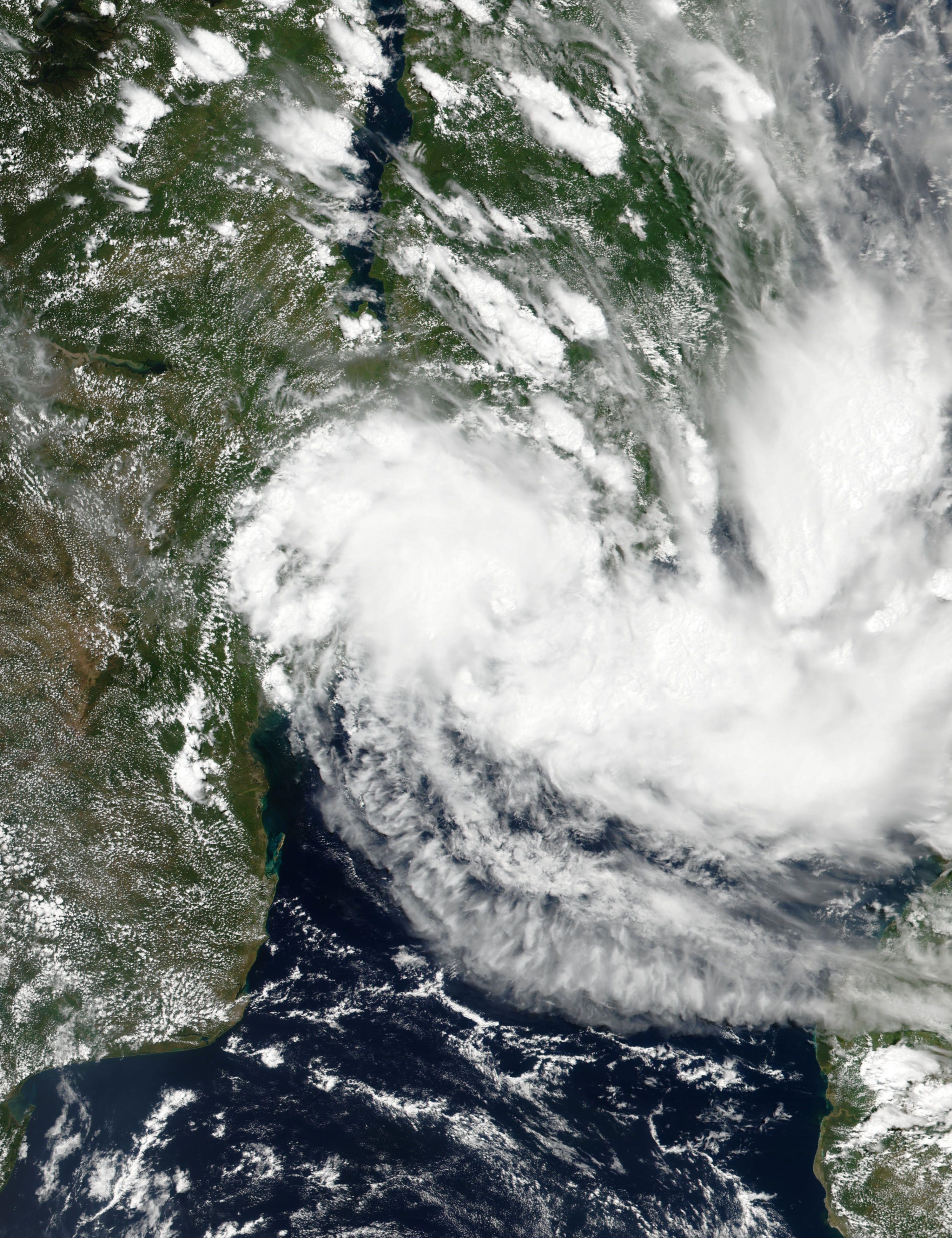 강렬한 열대 사이클론 이다이가 3월 14일 최고 강도에 도달한 직후 모잠비크에 접근하는 모습