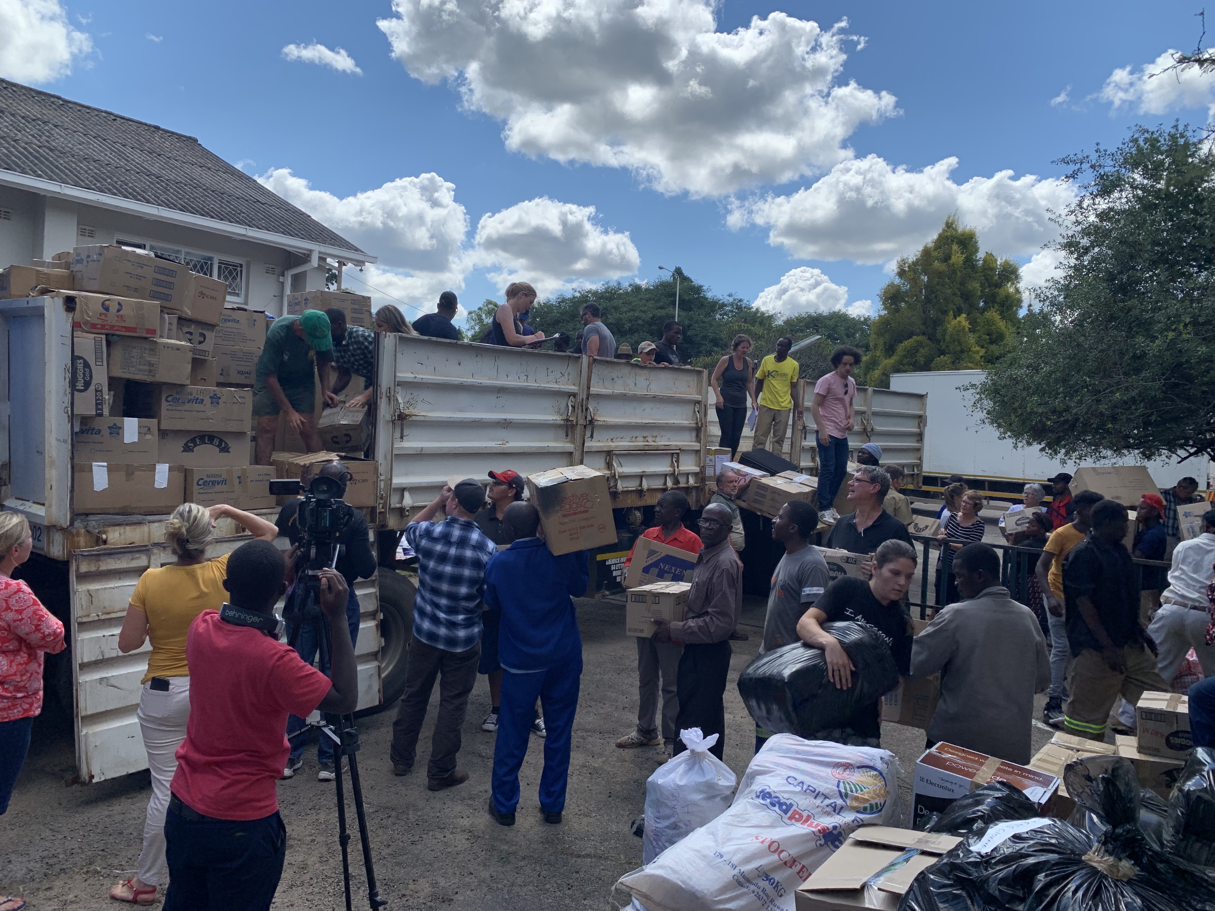 자원봉사자들이 짐바브웨 치마니마니 지구(Chimanimani District)의 이다이 피해자들에게 구호 물품을 전달하고 있습니다.