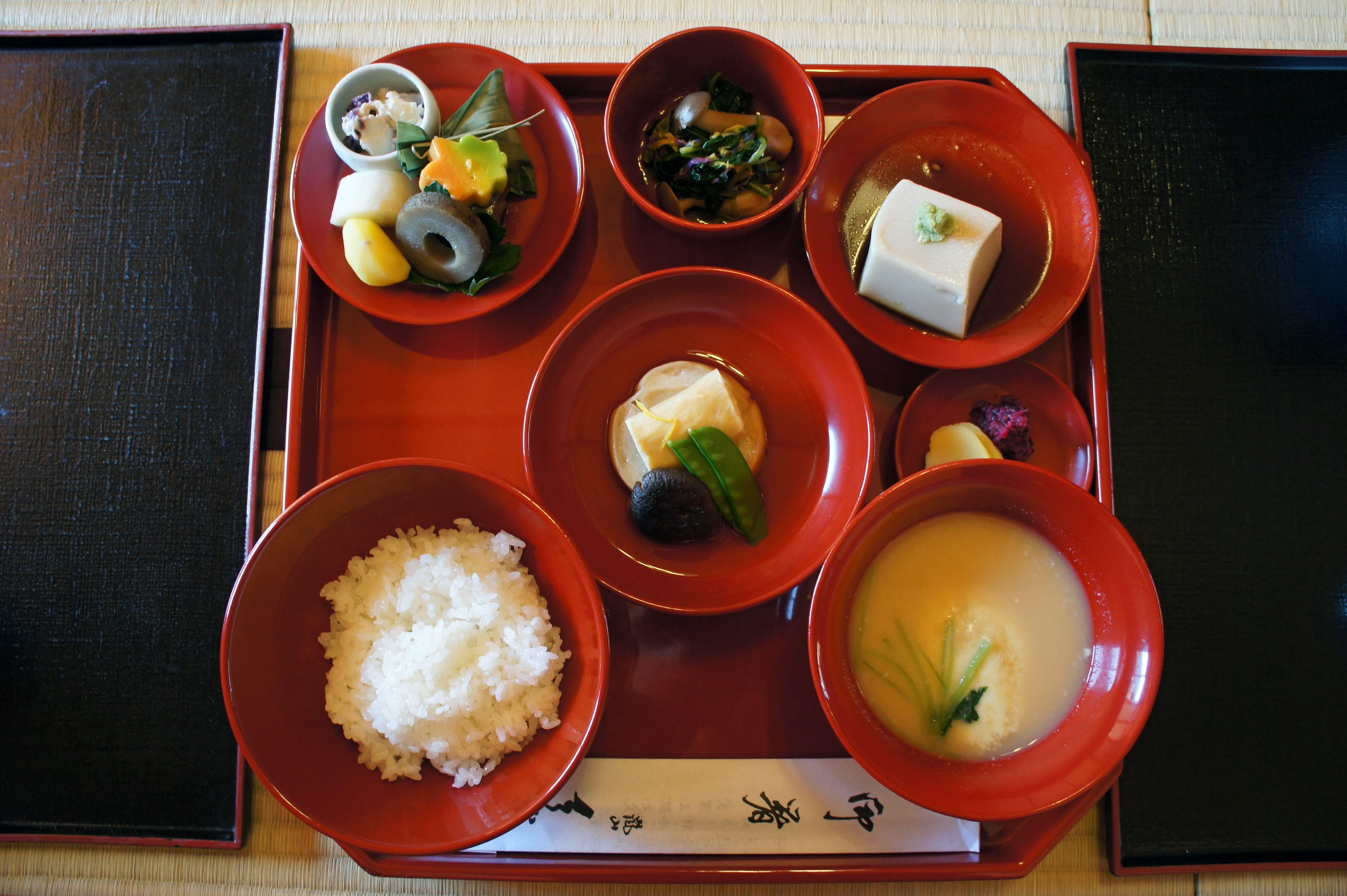 - 동물성 식재료 금지: 불교의 살생 금지 계율에 따라 육식은 물론 생선, 달걀 등 동물성 식재료를 사용하지 않는다.[16] 대승불교에서는 『능가경』에 따라 승려의 육식을 금지한다.