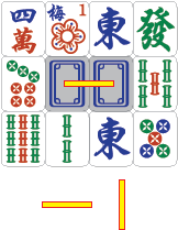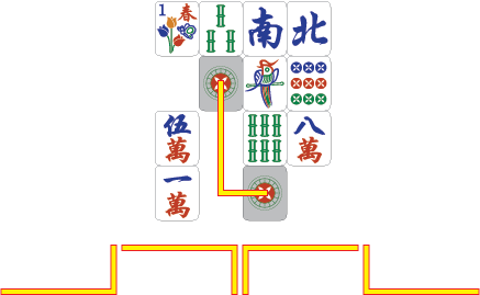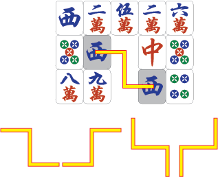 - 동일한 모양의 패 2개 사이에 다른 패가 있을 경우, 수평 또는 수직의 직선으로 연결하여 그 선이 구부러지는 횟수가 2회 이내일 때 (즉, 3개 이내의 수직선 또는 수평선의 조합으로 2개의 패를 이을 때)[1]