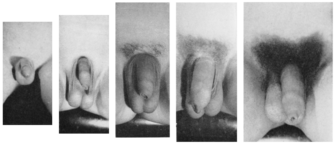 남성의 경우, 고환의 비대는 사춘기의 첫 번째 신체적 징후이며 (사춘기 고환 발달이라고 함), 사춘기 이전 남성의 고환은 1세경부터 사춘기 시작까지 크기 변화가 거의 없으며, 길이는 약 2cm에서 3cm, 너비는 약 1.5cm에서 2cm 정도이다. 고환의 크기는 남성 생식기에 대한 타너 스테이지의 매개변수 중 하나이며, 1단계는 1.5ml 미만의 부피를 나타내고, 5단계는 20ml 이상의 고환 부피를 나타낸다. 고환의 크기는 사춘기 시작 후 약 6년 후에 최대 성인 크기에 도달한다. 18~20ml는 평균 성인 크기이지만 정상적인 인구집단에서 고환 크기는 다양하다. 남성의 고환이 약 1년 동안 비대해지고 발달한 후에는 음경의 길이가 늘어나고 너비가 증가하며 귀두와 음경 해면체도 성인 크기로 커지기 시작한다.[29]