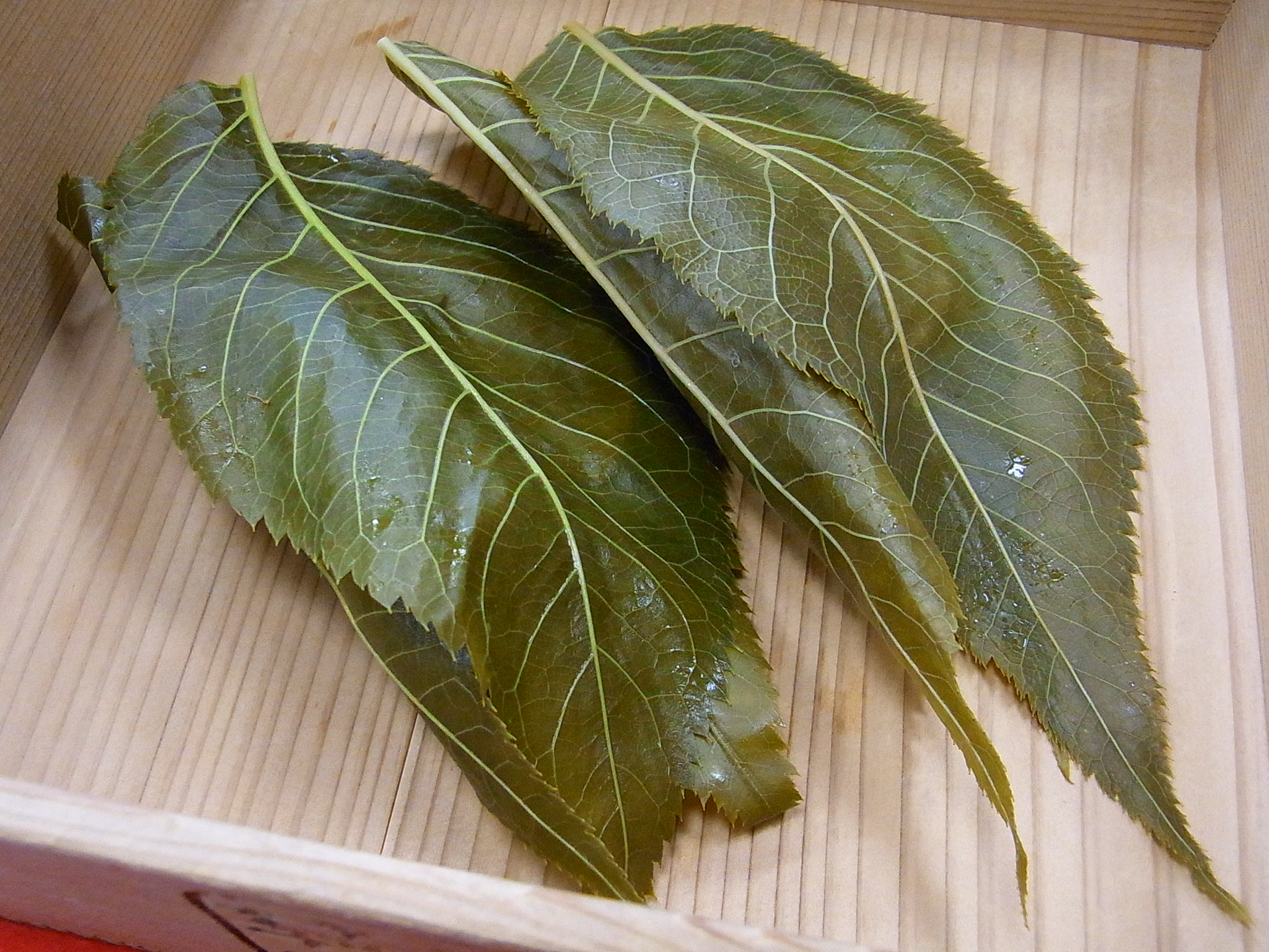 벚나무 생잎에는 소금에 절인 향이 없으며, 벚꽃 잎을 소금에 절여 향을 낸다. 벚꽃 잎은 향을 더하고, 잎으로 감싸 내용물의 건조를 방지한다.[25] 잎이 부드럽고 털이 적은 오시마 벚나무 잎을 소금에 절여 사용한다.[25] 이 소금에 절인 벚꽃 잎은 전국 점유율의 70% 정도가 이즈 반도의 마쓰자키정에서 생산된다. 떡의 크기와 외관상의 균형으로 인해, 관동 지방에서는 큰 잎, 긴키 지방에서는 작은 잎을 선호하는 경향이 있다.