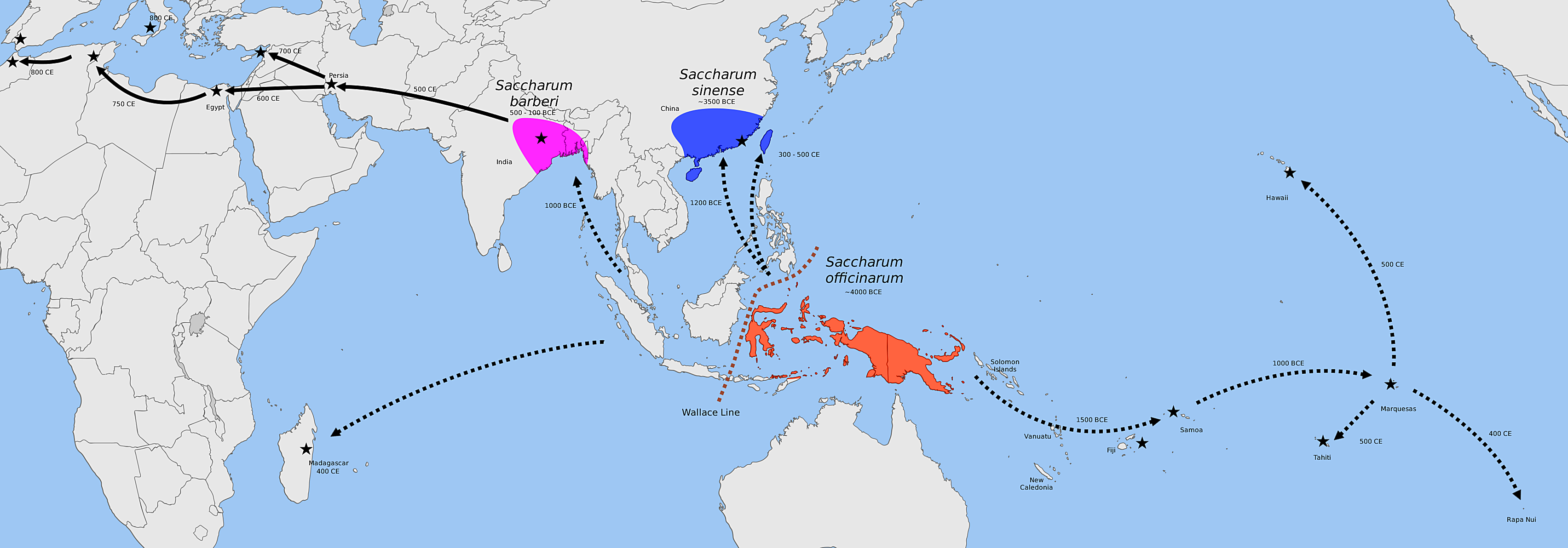 사탕수수는 남아시아와 동남아시아가 원산지이다.[87] 인도인들은 5천년 전부터 사탕수수 수액에 함유된 자당을 이용하였다. 사탕수수는 8세기경 아랍 세계로 유입되었고, 곧이어 지중해, 메소포타미아, 스페인, 북아프리카 등지로 전파되었다. 10세기 무렵에는 메소포타미아 인근에서 사탕수수를 재배하지 않는 곳이 없을 정도였다.[88]한편, 중국에서는 기원전 2세기 경부터 사탕수수 재배가 시작되었고, 유럽에서는 아랍인에 의해 711년 경 스페인의 마리다 섬과 카나리아 제도에서 재배되어 전파되었다. 16세기에 이르러 북아메리카에서도 사탕수수가 재배되기 시작하였다.[89]