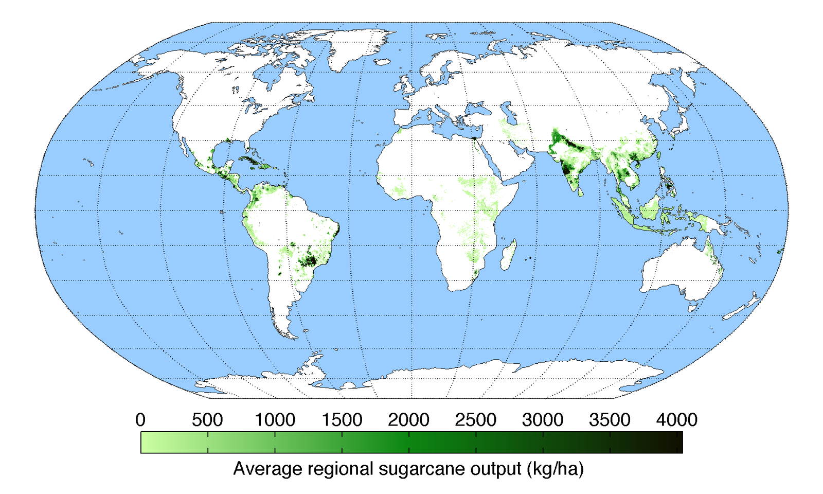 사탕수수는 약 195개국에서 매년 15억 톤이 넘게 재배 및 수확되고 있으며, 이는 사탕무의 6배가 넘는 수치이다. 브라질과 인도는 최대 산출국으로, 2007년 통계에 의하면 브라질에서만 5억 1천만 톤, 인도에서는 3억 5천만 톤의 사탕수수가 수확되었다.[86]