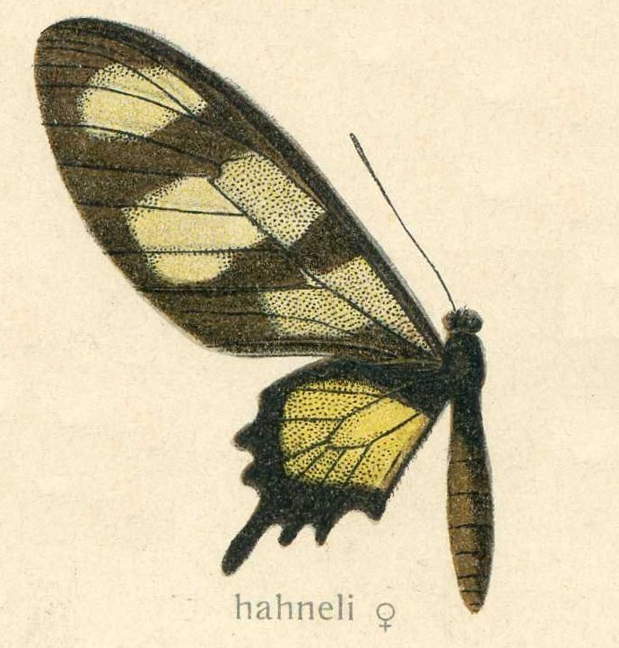 브루키아나붉은목도리비단제비나비는 비단제비나비과의 나비로, 수컷은 검은색 바탕에 녹색 무늬, 암컷은 갈색 바탕에 흰색 섬광을 가지며, 여러 아종으로 나뉜다. - 한국의 곤충 - 말벌
