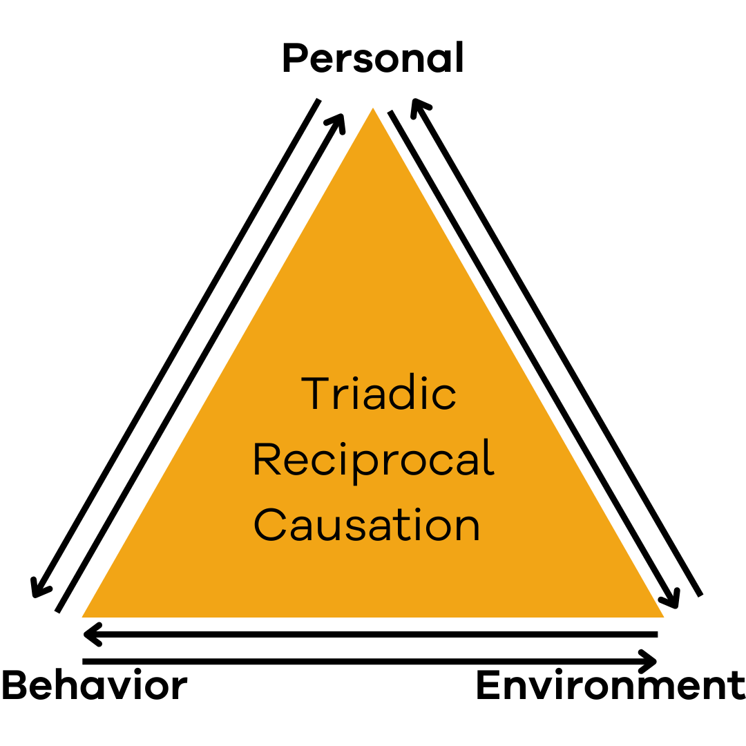 반두라가 제시한 삼원적 상호 인과 모델은 학습이 개인, 환경, 행동 간의 상호작용을 통해 일어난다는 것을 설명한다.[61] 이 모델에서 학습은 직접 경험뿐만 아니라 다른 사람을 관찰함으로써 이루어지며, 인간은 환경의 영향을 받을 뿐만 아니라 스스로 환경을 만들 수도 있다.[68][86]
