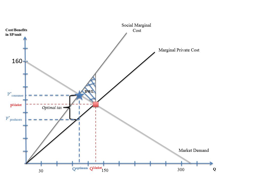 이러한 시장 실패를 교정하기 위해 아서 세실 피구는 외부 비용만큼 세금을 부과하는 피구세를 제안했다.[6] 이 세금은 기업의 사적 비용을 증가시켜 사회적 비용을 반영하게 함으로써(MPC + Tax = MSC), 생산량을 사회적 최적 수준으로 유도하는 것을 목표로 한다. 환경세 등이 이러한 개념을 활용한 예시다.