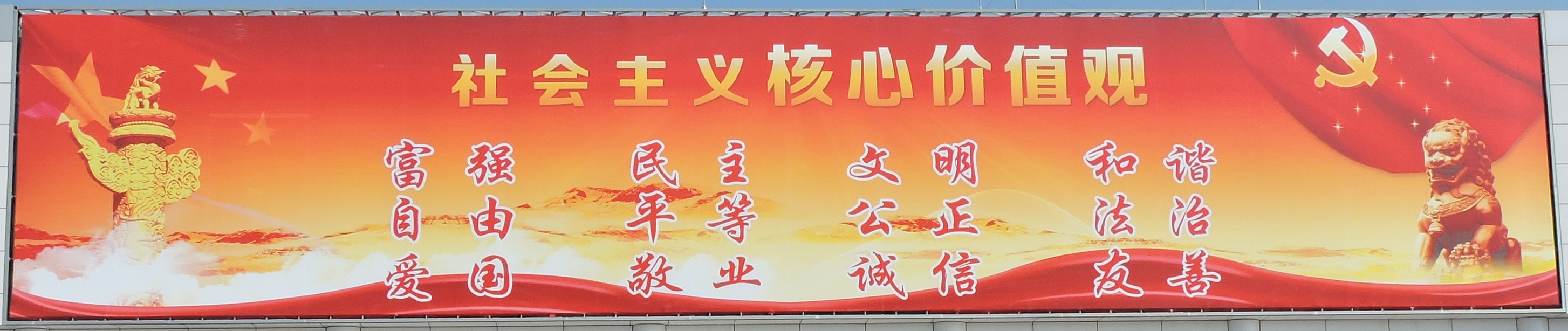 중국 전역의 주택가, 학교, 유치원, 회사, 유원지, 레스토랑 등 공공 공간에는 이 가치관의 내용이 적힌 게시판을 쉽게 찾아볼수 있다.
