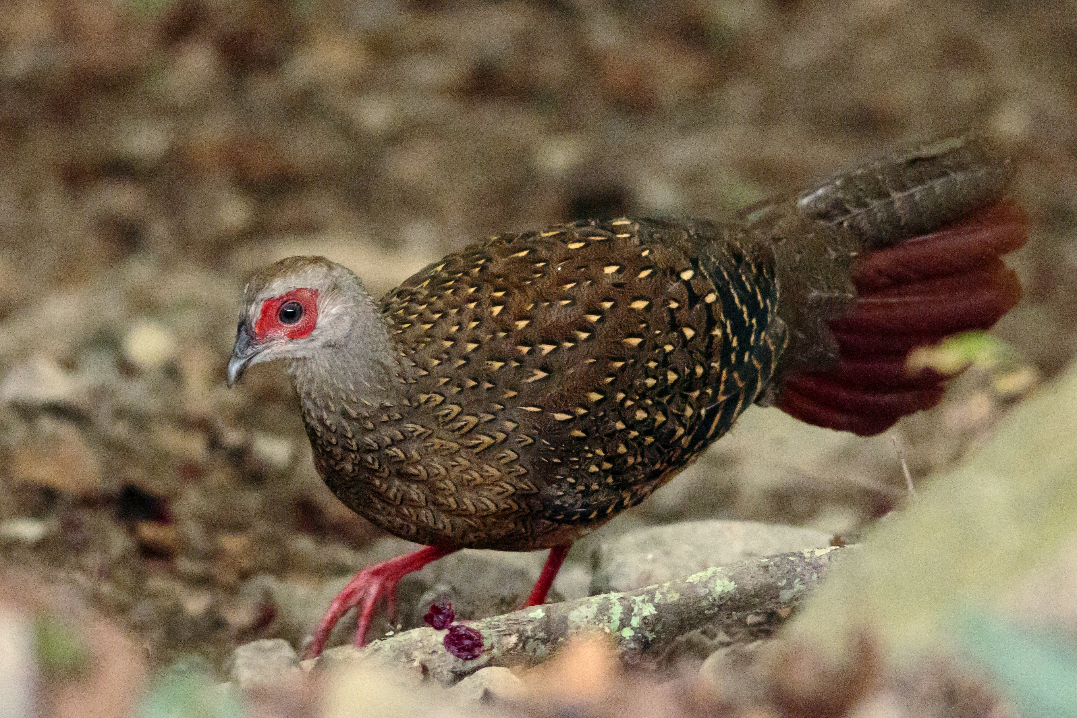 구애 행동을 할 때 수컷의 육수는 붉게 충혈되며, 암컷 주위를 원을 그리며 달리다가 점프하는 행동을 보인다.[1] 때때로 꼬리를 부채처럼 펼치는 정면 전시 행동도 관찰된다.[1] 또한 다른 ''Lophura'' 속 자고새들처럼 날개를 펄럭이는 행동도 한다.[1]