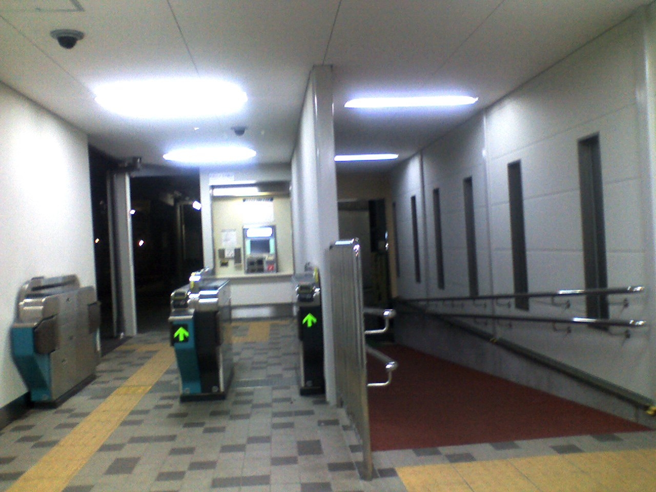 - 남쪽 개찰구: 2001년에 신설된 사카에마치 방면 승강장 직결 개찰구이다. 계단이 없어 이용객이 많다. 종일 무인이나 자동 정산기가 설치되어 있고, 비자기화권(내부 구입 등)은 인터폰으로 북쪽 개찰구 역무원에게 신청, 확인 카메라에 표를 제시하여 개찰구 문을 연다. 2006년 11월 자동 정산기 설치 전에는 정산 시 북쪽 개찰구를 이용해야 했다.