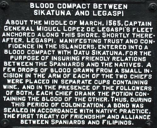 : 1565년 레가스피가 보홀에 도착하고 시카투나 다투가 스페인 국왕에게 충성을 맹세하면서 산두고(Sandugo)가 시작되었습니다. 레가스피와 시카투나는 각자 왼팔에 단검(단검)으로 상처를 내어 잔에 채워 놓은 포도주에 피를 섞은 후, 우정을 기념하며 함께 마셨습니다.[5]