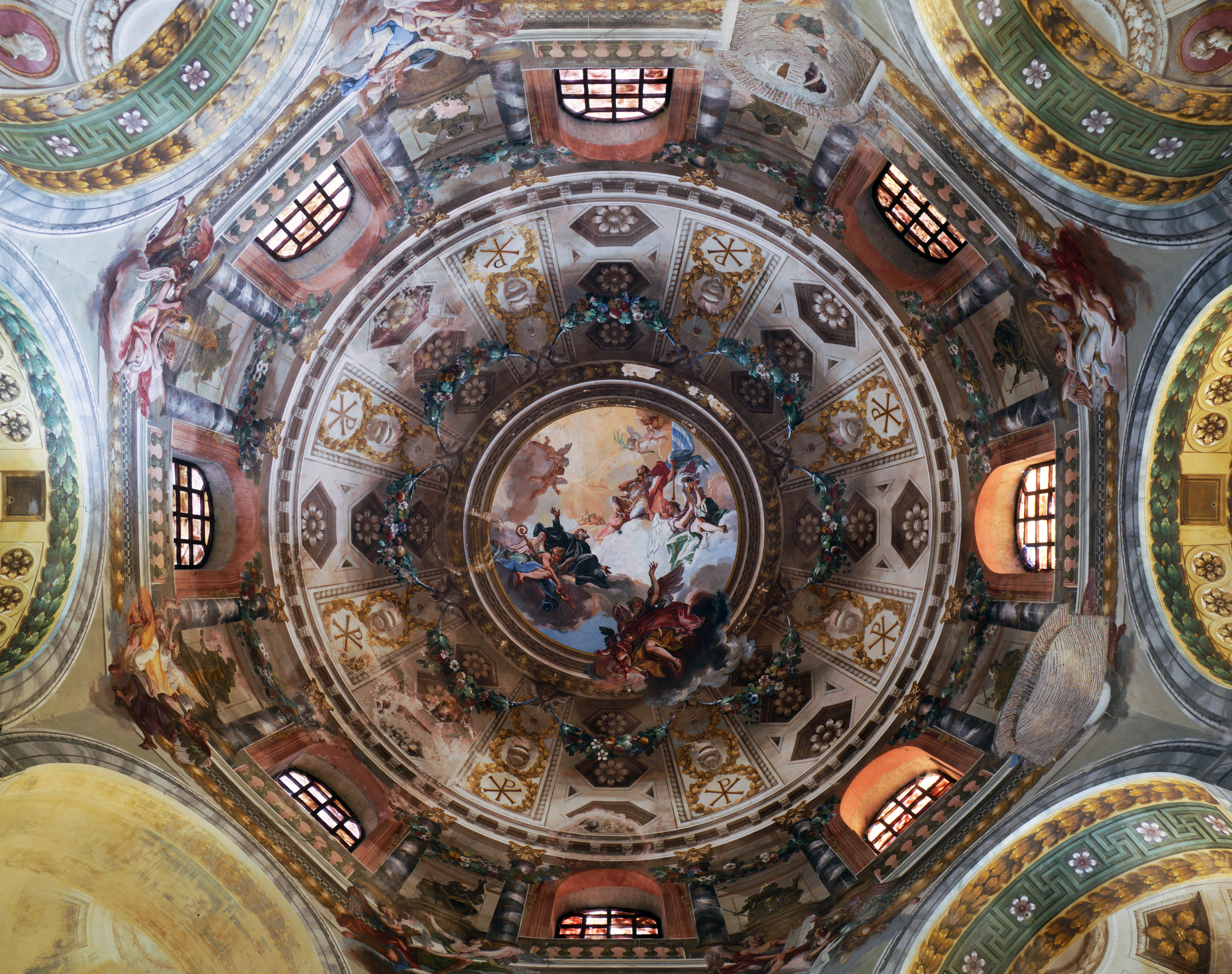 내부 공간에는 이탈리아 전통의 특질도 보인다. 얇은 벽돌을 두꺼운 모르타르 줄눈으로 쌓는 방식은 동방의 것이지만,[24] 돔은 굽지 않은 도제 파이프를 쌓아 만들어 라벤나 지역 장인의 솜씨를 보여준다. 또한, 내진은 8개의 아케이드 상부에 높은 창이 있는 드럼을 가지고 그 위에 돔이 얹혀 있는 구조로, 하기아 소피아와 달리 돔의 존재를 덜 의식하게 하고 아케이드와 돔의 인상을 날카롭게 대비시킨다.[25]