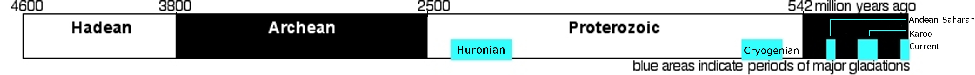 산소가 대기 중에 축적되기 시작하면서 두 가지 주요 결과가 나타났다.- 산소는 대기 중의 메탄(강력한 온실 기체)을 이산화 탄소(약한 온실 기체)와 물로 산화시켰을 것이다. 이는 지구 대기의 온실 효과를 약화시켜 행성 냉각을 유발했으며, 이는 24억 5천만 년 전에서 22억 2천만 년 전까지의 휴론 빙하기로 알려진 일련의 빙하기를 촉발한 것으로 제안되었다.[86][87][88]