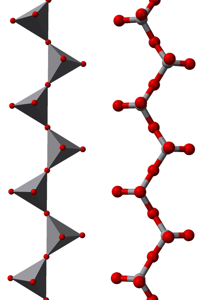 세 꼭짓점을 공유하면 구조는 2차원으로 확장된다. 각섬석(석면이 대표적인 예)에서는 두 개의 사슬이 사슬을 따라 교대로 세 번째 꼭짓점을 공유하며 서로 연결되어 이중 사슬 구조를 형성한다. 이는 이상적인 화학식 [Si4O11]6-을 가지며, 이러한 광물이 나타내는 섬유질 특성을 설명해준다. 모든 사면체가 세 꼭짓점을 다른 사면체와 공유하면 운모(화학식 [Si2O5]2-)와 같은 시트 구조가 형성될 수 있다. 즉, 규소에 결합된 4개의 산소 중 3개는 다른 규소와도 결합한다. 결정성 운모는 매우 얇은 시트로 쪼개지는 성질을 가진다.