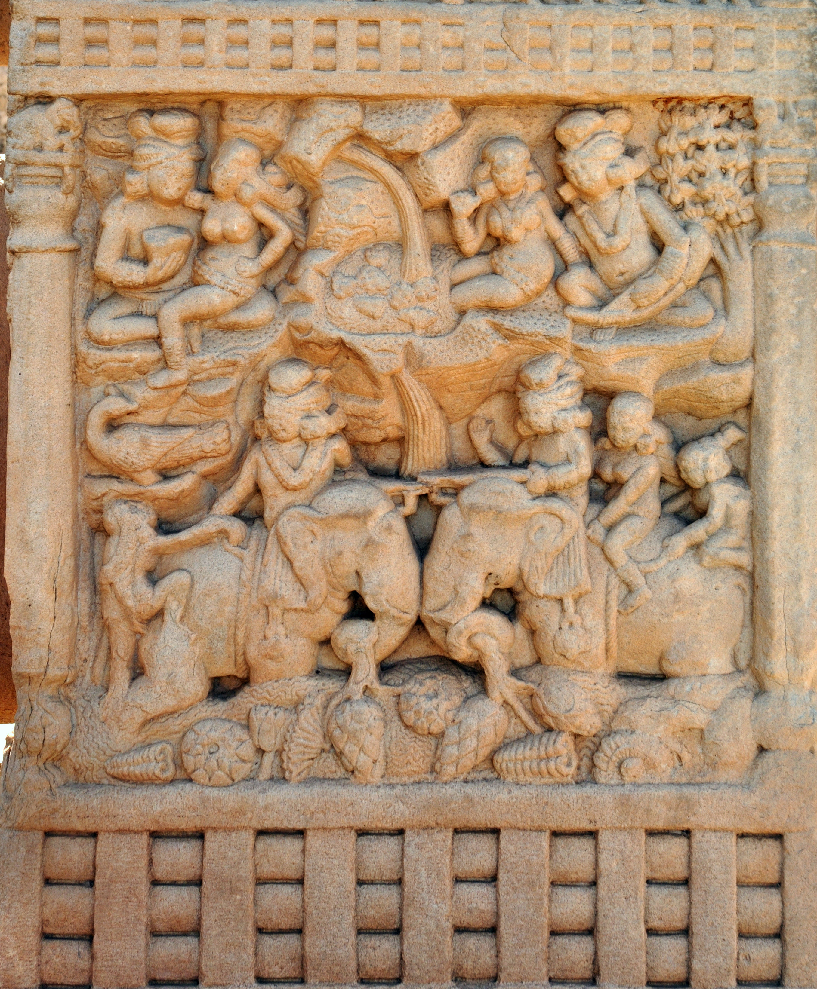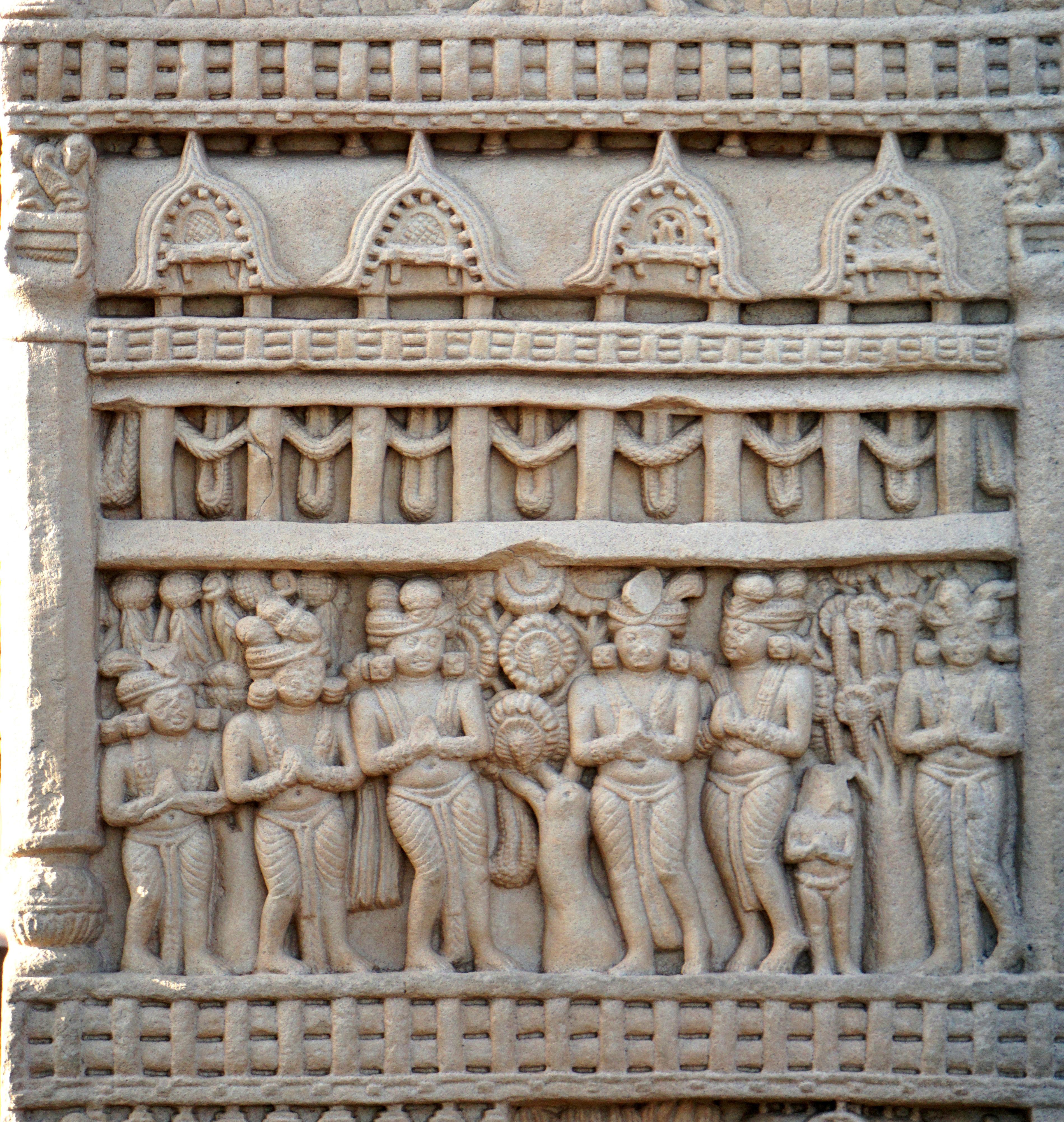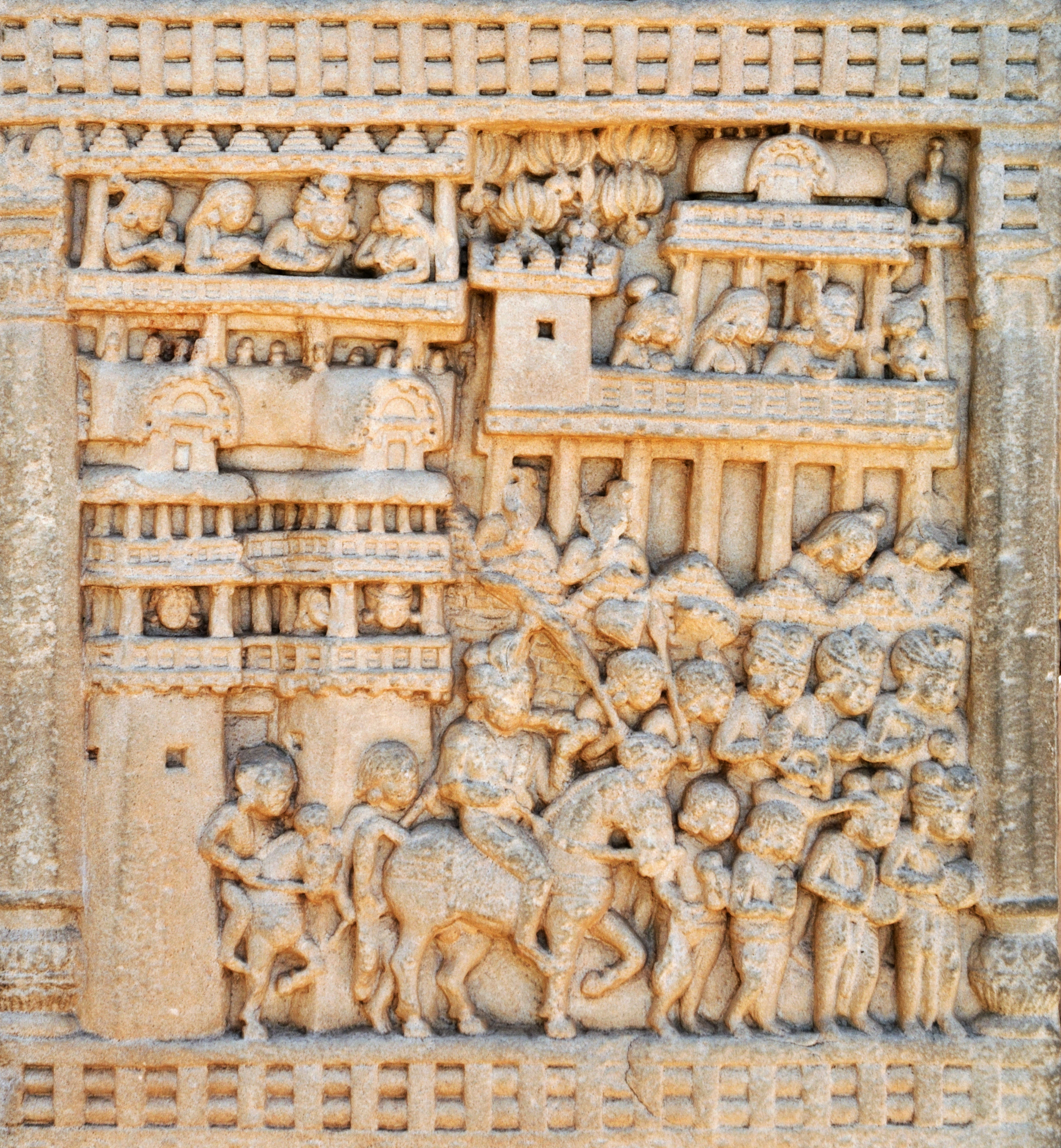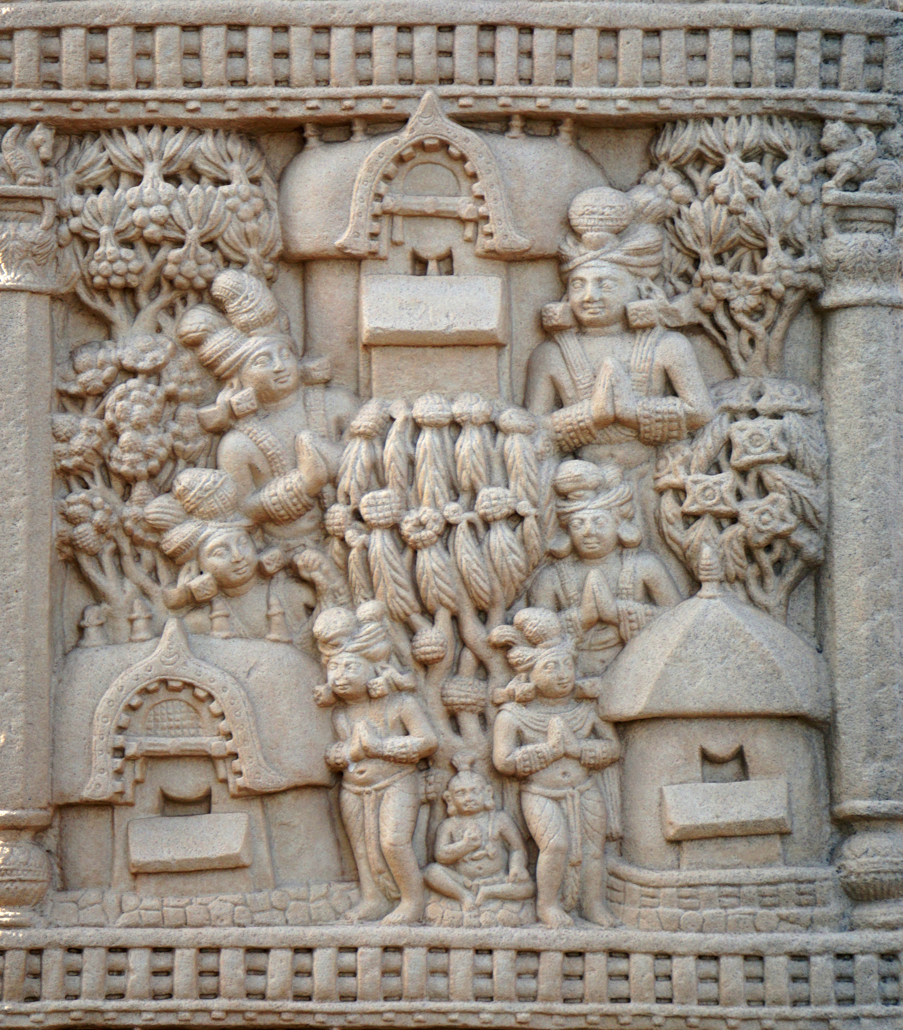산치의 부조, 특히 인도의 도시를 묘사한 부조는 고대 인도 도시가 어떻게 생겼는지 상상하는 데 중요했다. 많은 현대 시뮬레이션은 산치의 도시 그림을 기반으로 한다.[147]