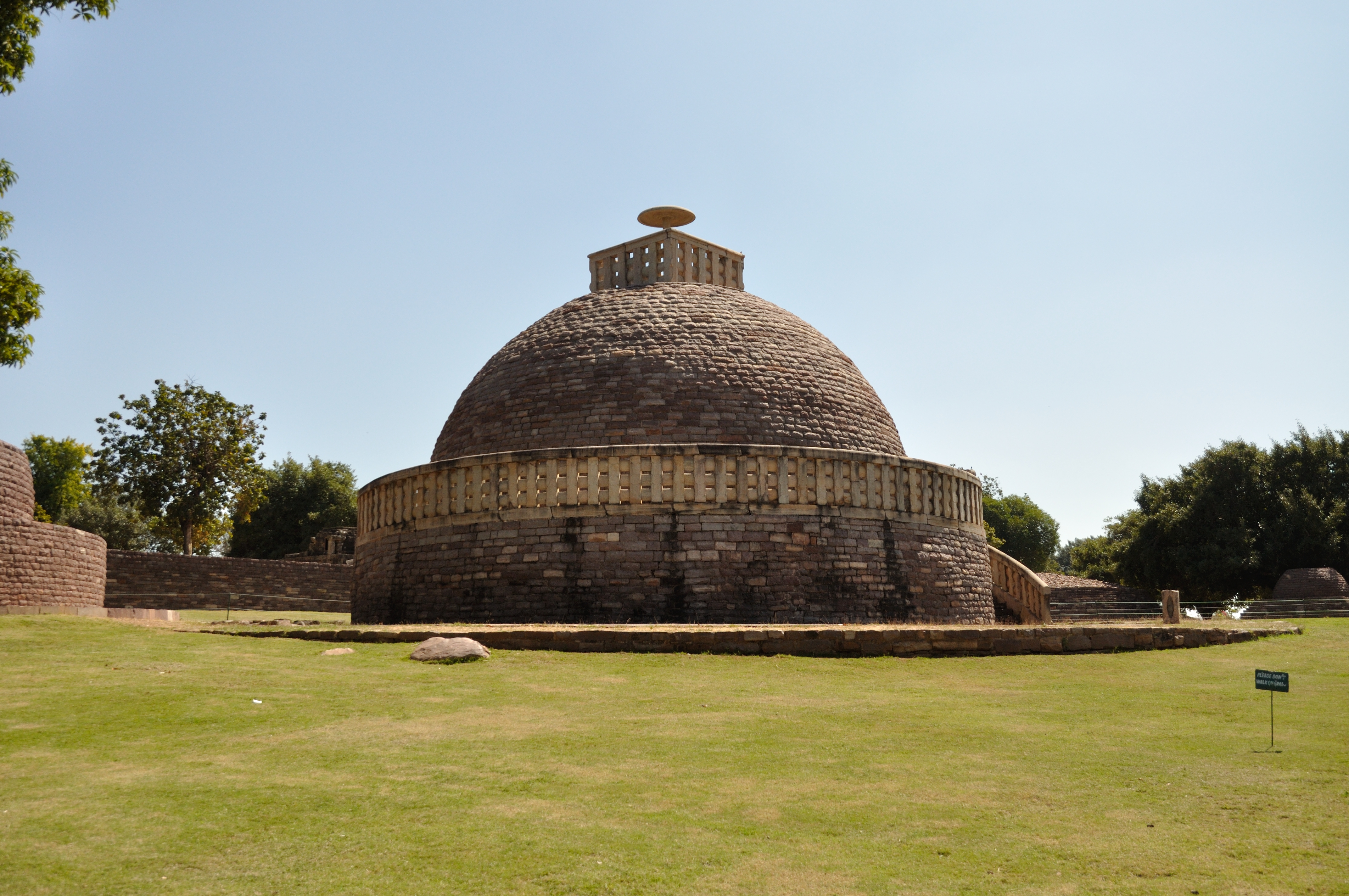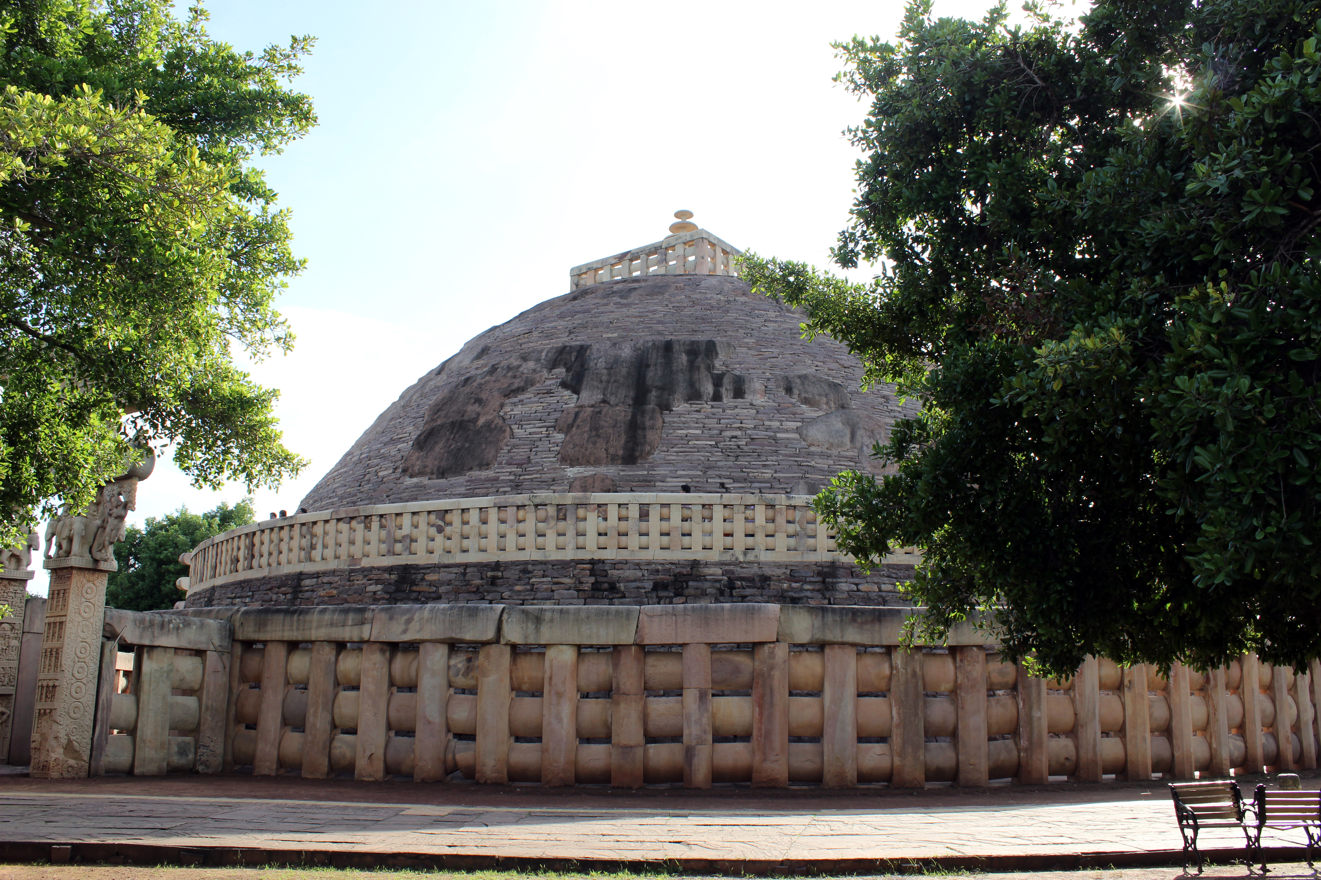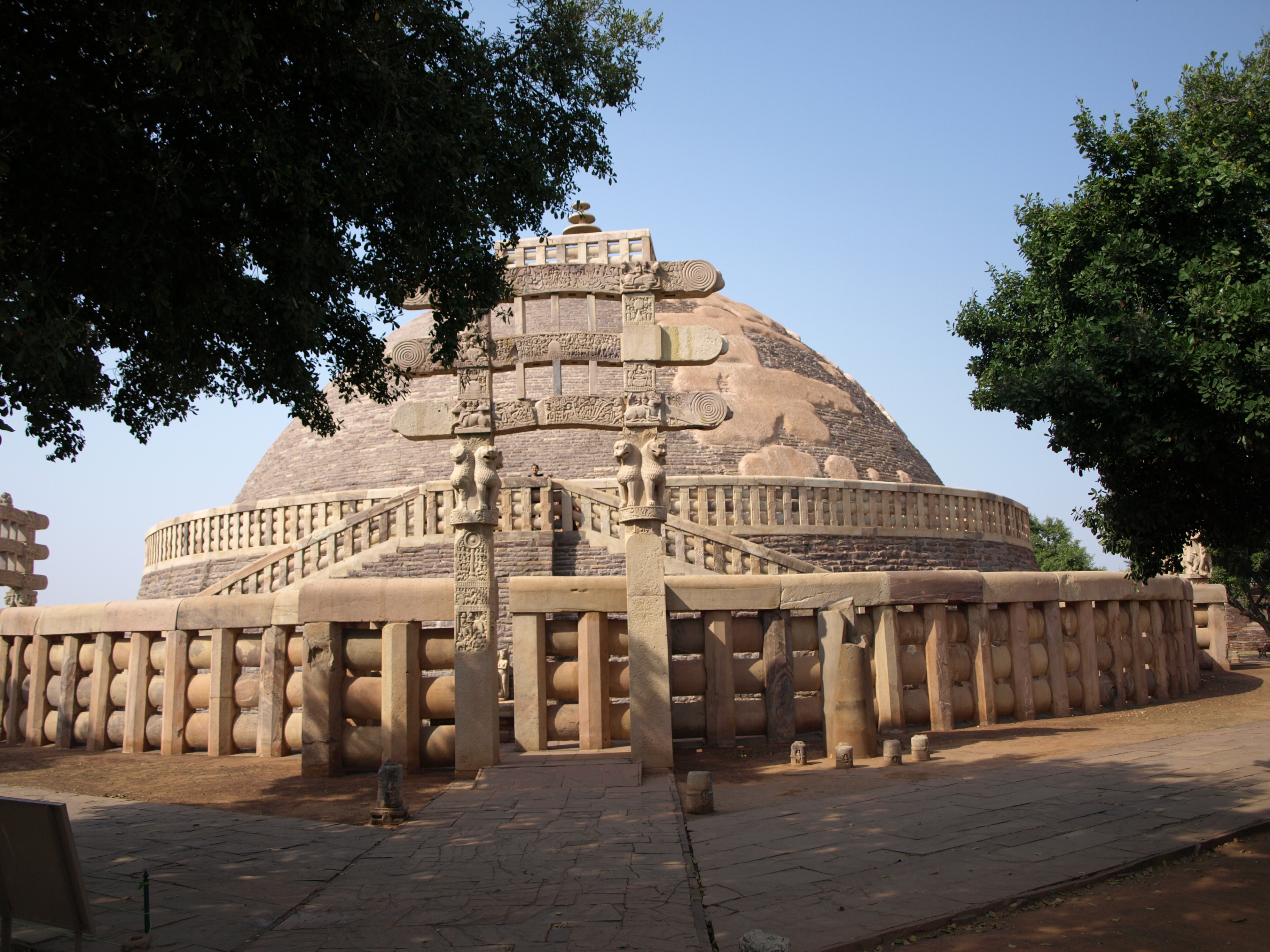 산치의 "대탑"은 가장 오래된 구조물이며, 기원전 3세기에 마우리아 제국의 아소카 대왕이 처음 건설을 명했다.[6] 그 핵심은 부처의 성스러운 유물 위에 세워진 반구형 벽돌 구조물이었다.[6] 기단에는 기단이 있었고, 꼭대기에는 난간과 석조 우산, 즉 높은 지위를 상징하는 파라솔과 같은 구조물인 차트라가 있었다.[7][8] 원래 탑의 지름은 오늘날의 탑의 절반 정도였으며, 이는 숭가 왕조에 의해 확장된 결과이다. 현재 덮여 있는 돌과 달리 벽돌로 덮여 있었다.[7]