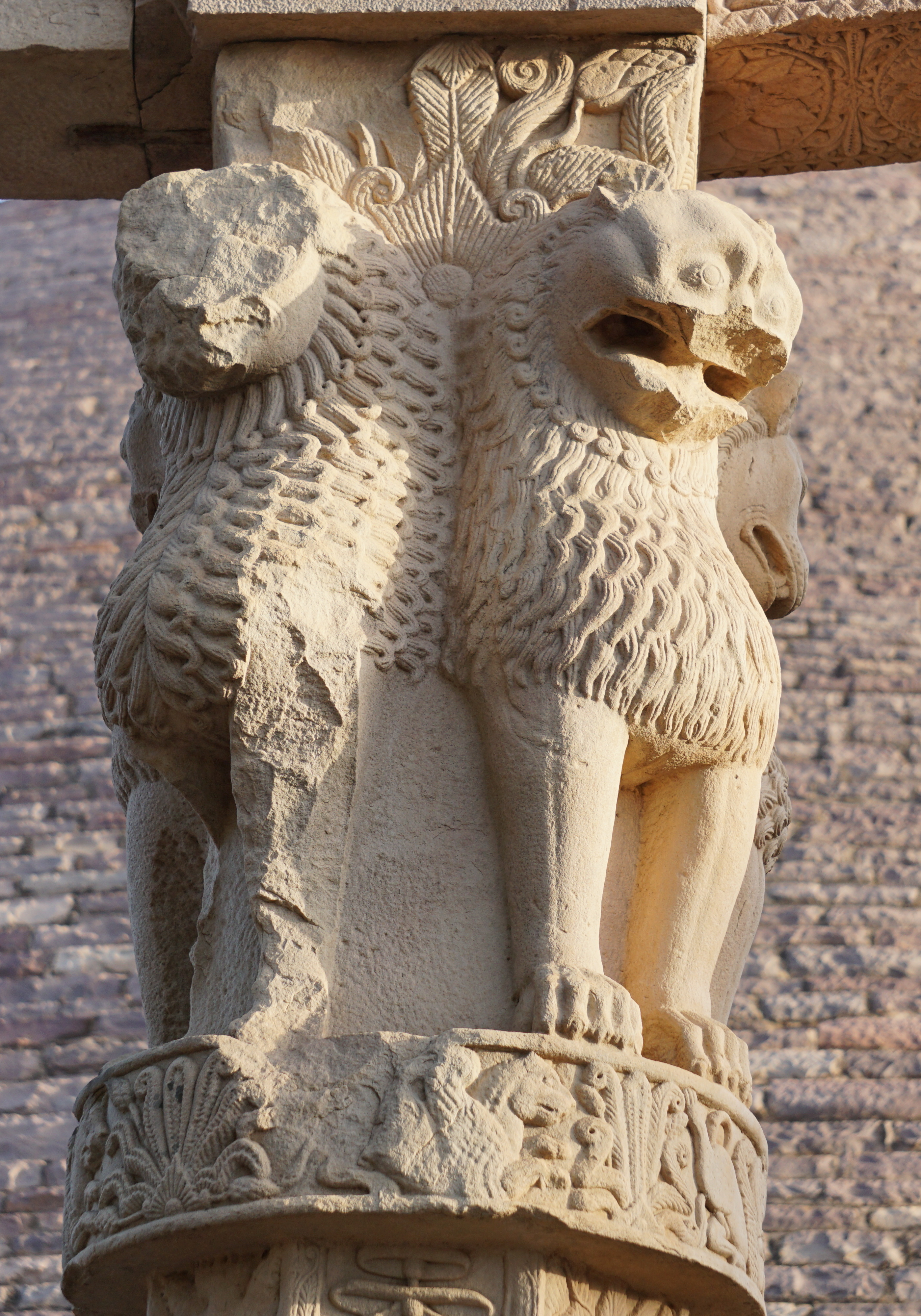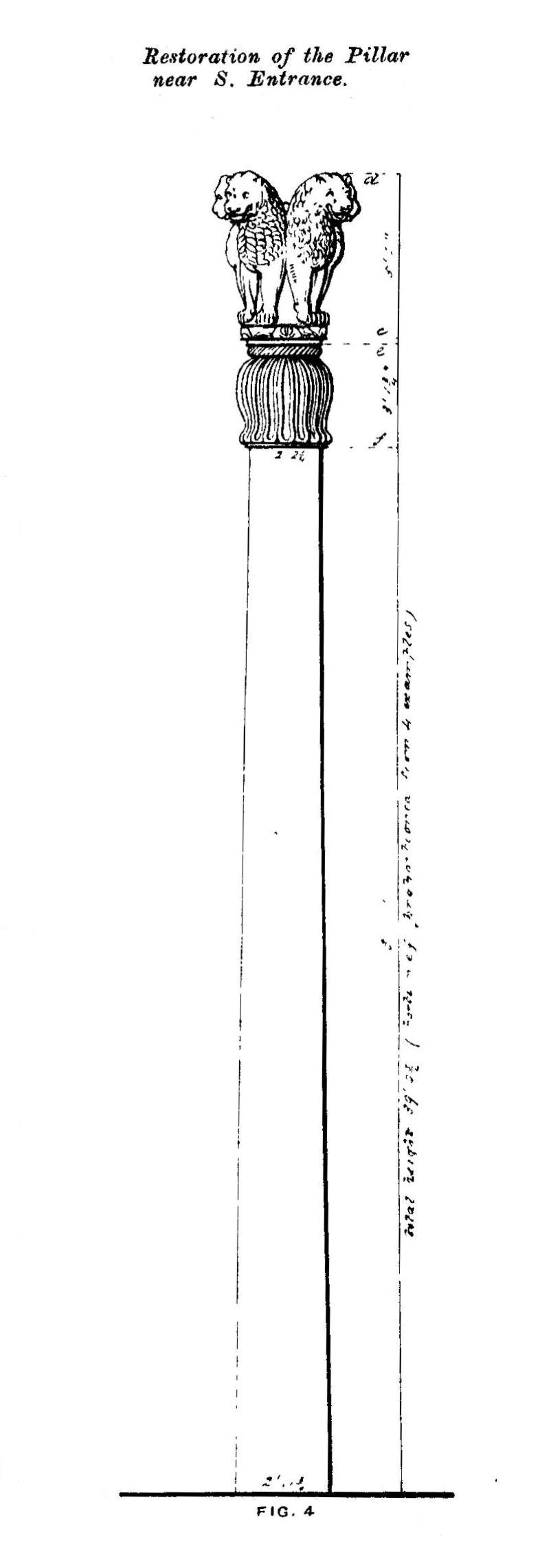 기둥은 온전했을 때 높이가 약 약 12.80m였으며, 종 모양의 주두와 주판, 네 마리의 사자가 서로 등을 맞댄 왕관 장식으로 된 둥글고 약간 가늘어지는 일체형 축으로 구성되었다. 주판은 쌍을 이룬 거위로 분리된 네 개의 불꽃 야자(flame palmette) 디자인으로 장식되어 있으며, 이는 부처의 제자들을 상징하는 것으로 보인다. 조각가의 뛰어난 기술을 보여주는 사자상은 현재 다소 훼손되었다.[15]