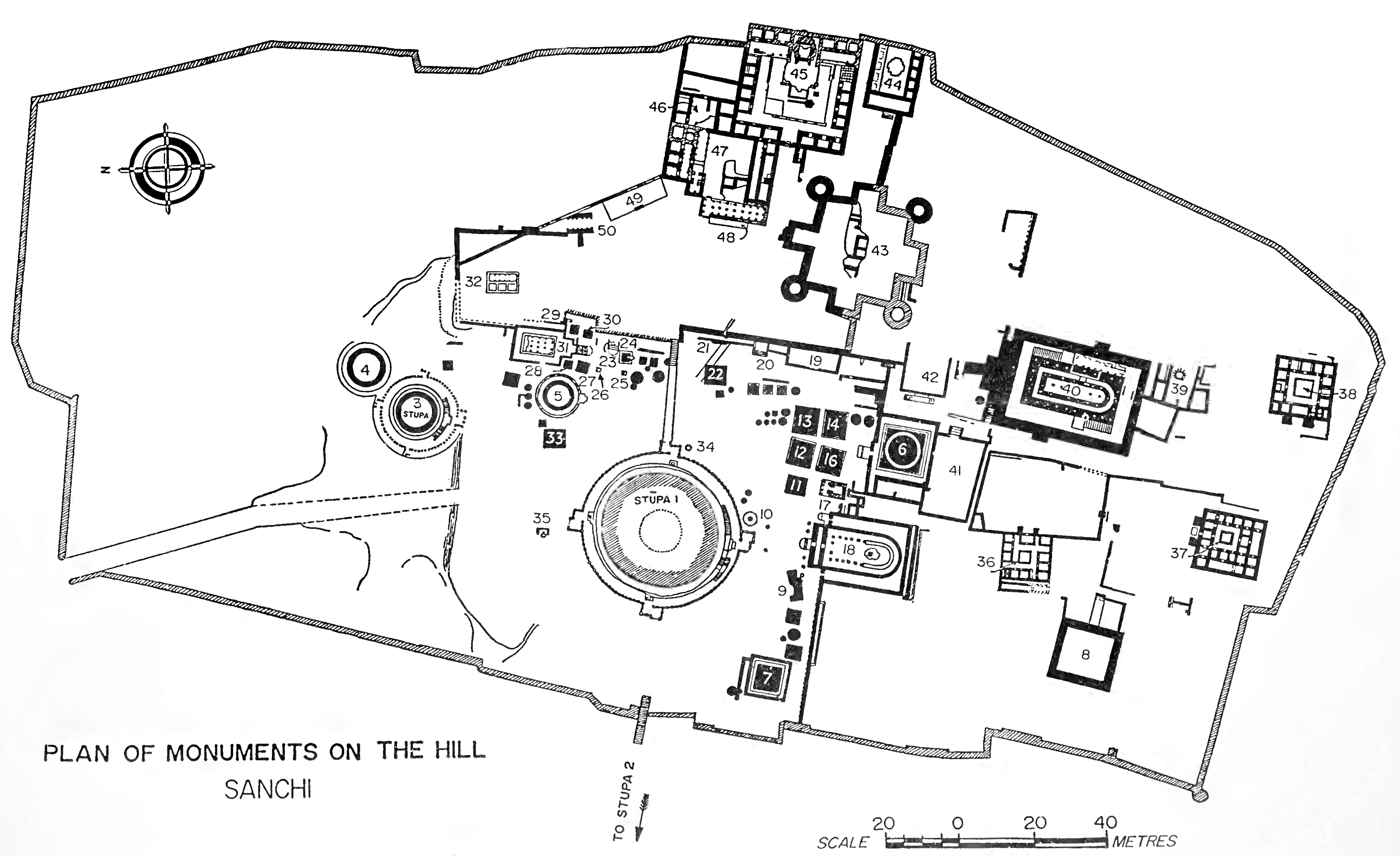 산치 언덕의 기념물 평면도, 1부터 50까지 번호가 매겨져 있음