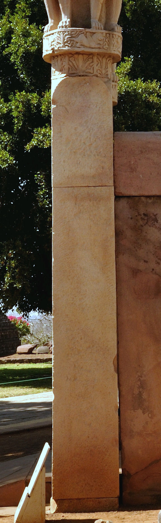 아쇼카 석주 중 하나인 정교하게 연마된 사암 기둥은 주요 토라나 게이트 옆에 세워졌으며, 기둥의 하단 부분은 여전히 남아 있다. 기둥의 상단 부분은 근처 산치 고고학 박물관에 보관되어 있다. 주두는 네 마리의 사자로 구성되어 있으며, 아마도 법륜을 지지했을 것으로 추정된다.[13] 이는 산치 부조에 있는 후기 삽화에서도 확인할 수 있다. 기둥에는 아쇼카 비문(분열 칙령)[13]과 굽타 시대의 장식적인 상크 립 비문이 새겨져 있다.[6] 초기 브라흐미 문자로 새겨진 아쇼카 비문은 불행히도 많이 손상되었지만, 사르나트와 카우삼비 칙령과 동일하게 불교 승가 내의 분열에 대한 처벌을 다루고 있다.